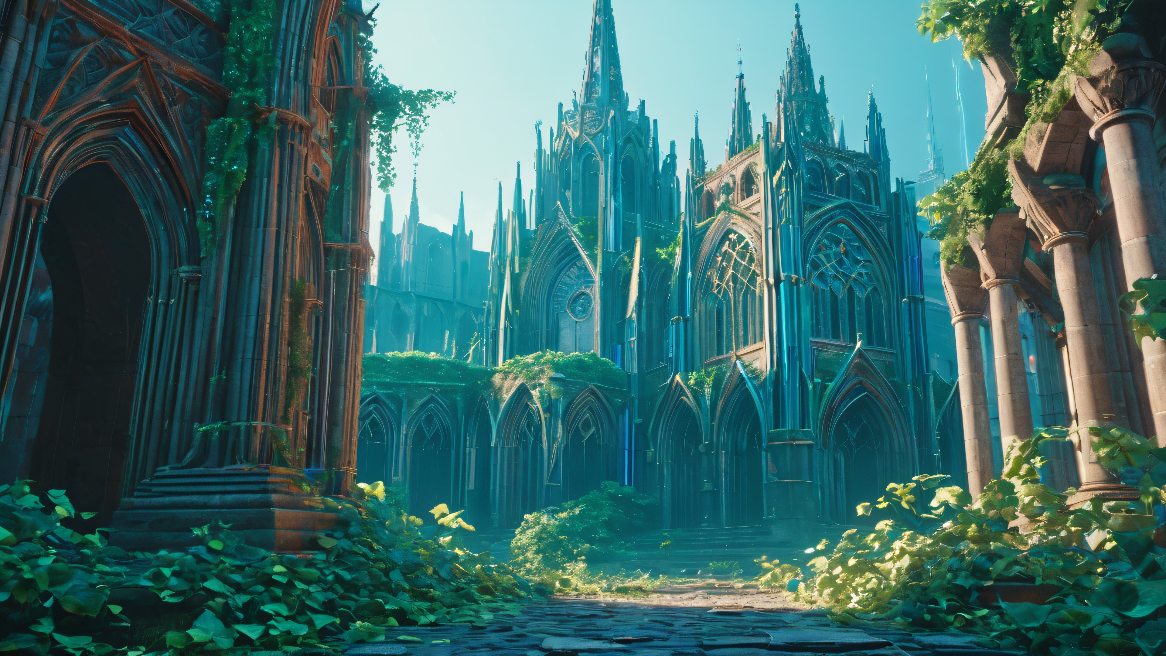 This stunning wallpaper features a mysterious, abandoned cathedral in the heart of a dystopian city, its walls adorned with intricate stone carvings and shattered stained glass windows. The atmosphere is thick with forgotten prayers and the scent of old leather-bound tomes. The dark, mist-shrouded cityscape stretches out beyond the cathedral’s crumbling spires and Gothic arches, overgrown with ivy and vines as if nature is reclaiming the ruins of a forgotten civilization.