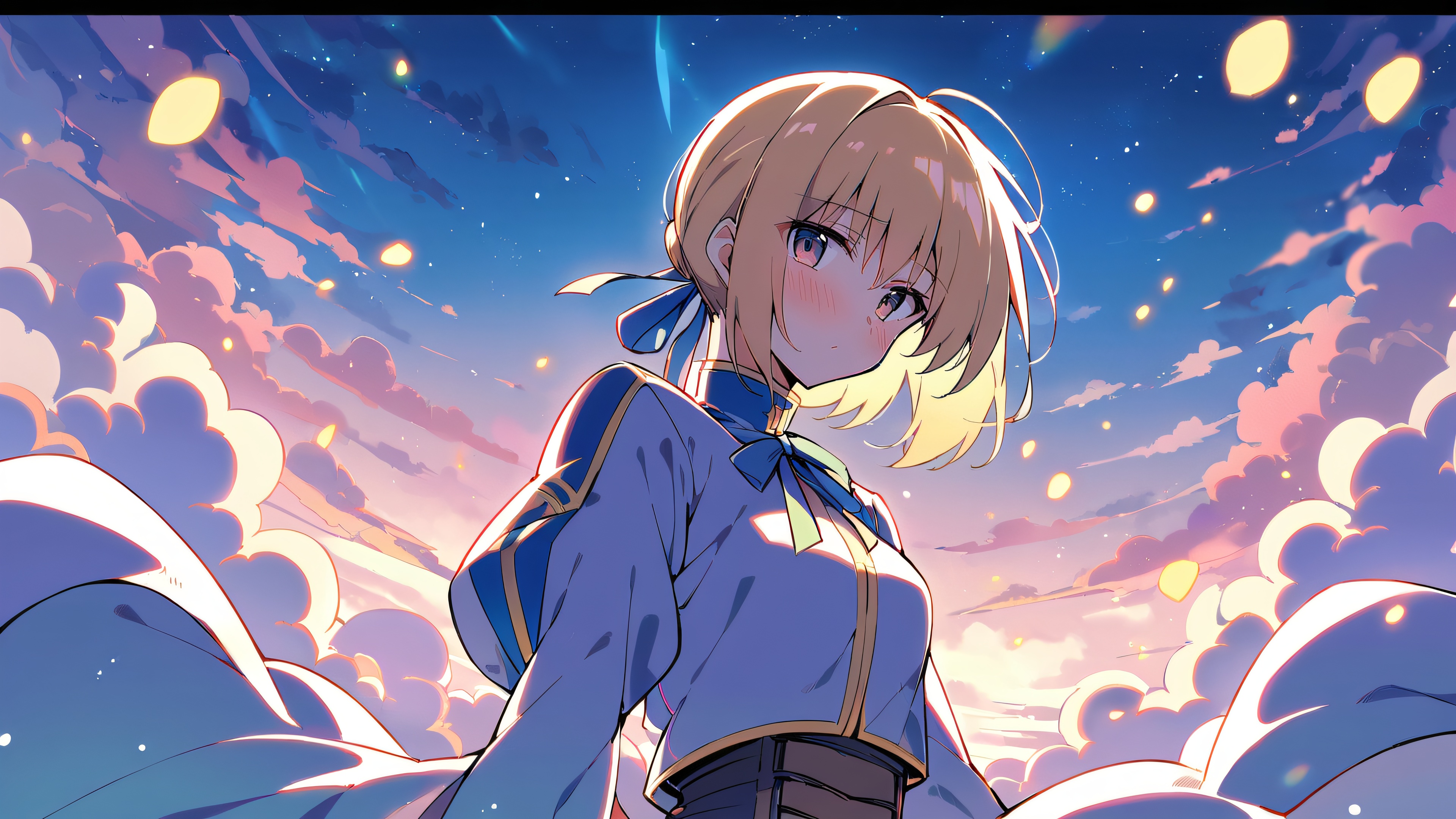 1girl, saber, fate/stay night, solo, masterpiece, best quality, very aesthetic, absurdres, highly detailed, looking at viewer, A perfectly clean vast pure void with extreme depth of field and subtle gradient effects., #FFFFFF (White), #F7D2C4 (Soft Pink), and #FFC0CB (Blush), 16:9 aspect ratio, bright and airy, ethereal lighting, beautiful sky, cinematic lighting, vivid colors
