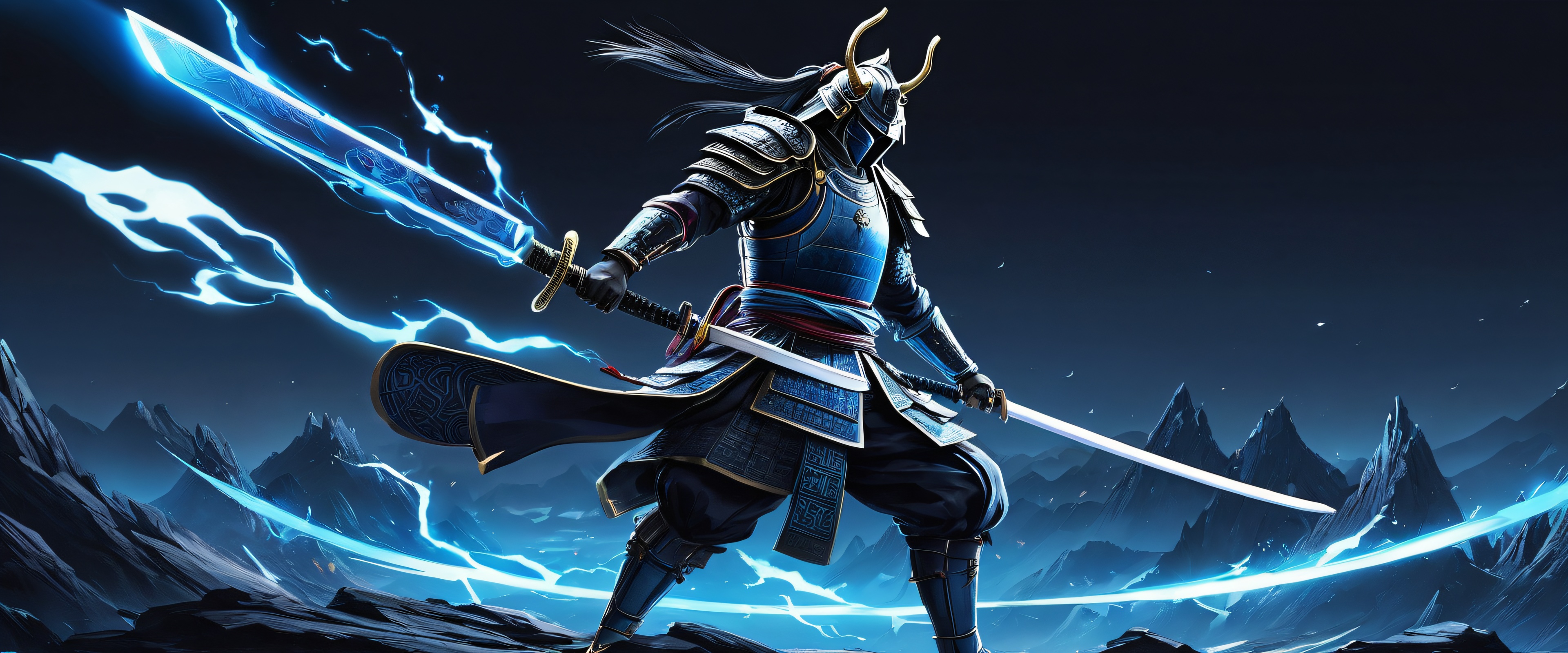 A breathtaking desktop wallpaper of Samurai, Perfectly clean vast pure void, extreme depth of field, against a black background., Award-winning digital art, pristine clarity, with a focus on epic video game inspired masterpieces., Ethereal lighting with radiant, brilliant colors, ray traced reflections, and pristine clarity. Bright and airy., [‘Metallic Grays’, ‘Neon Blues’, ‘Electric Whites’], 21:9 ultrawide panoramic aspect ratio, epic wide shot, ethereal lighting, radiant, brilliant colors, ray traced reflections, pristine clarity, award-winning digital art, epic breathtaking scale, stunning visual impact, perfect composition, highly textured surfaces, intricate micro-details, physically based rendering, macOS wallpaper aesthetic, masterpiece, highest quality, highly detailed, 8k resolution.