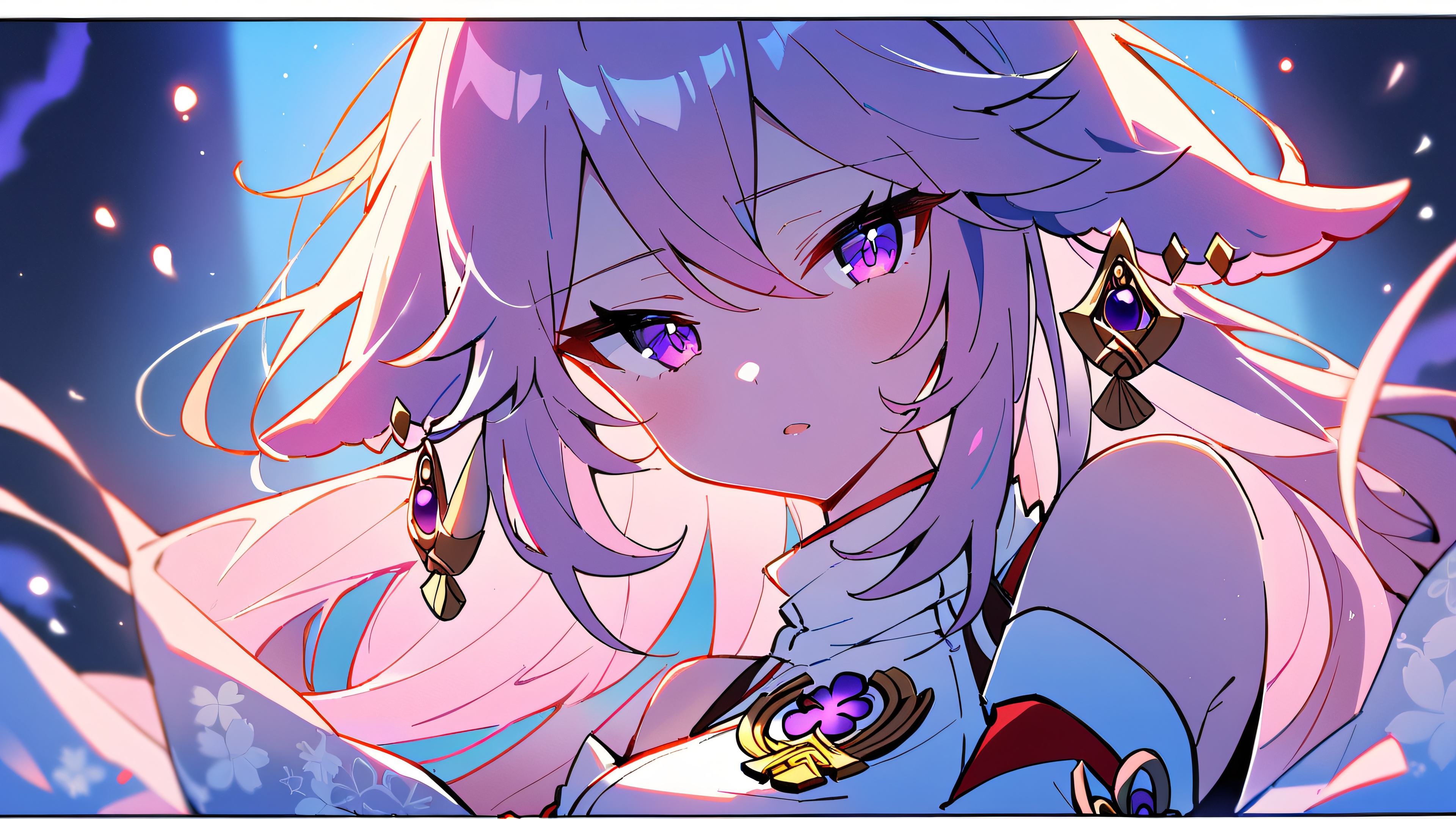 1girl, yae miko, genshin impact, solo, masterpiece, best quality, very aesthetic, absurdres, highly detailed, looking at viewer, Perfectly clean vast pure void, extreme depth of field, with subtle atmospheric lighting, [‘Soft Pink’, ‘Cream’, ‘Pastel Blue’], 16:9 aspect ratio, bright and airy, ethereal lighting, beautiful sky, cinematic lighting, vivid colors