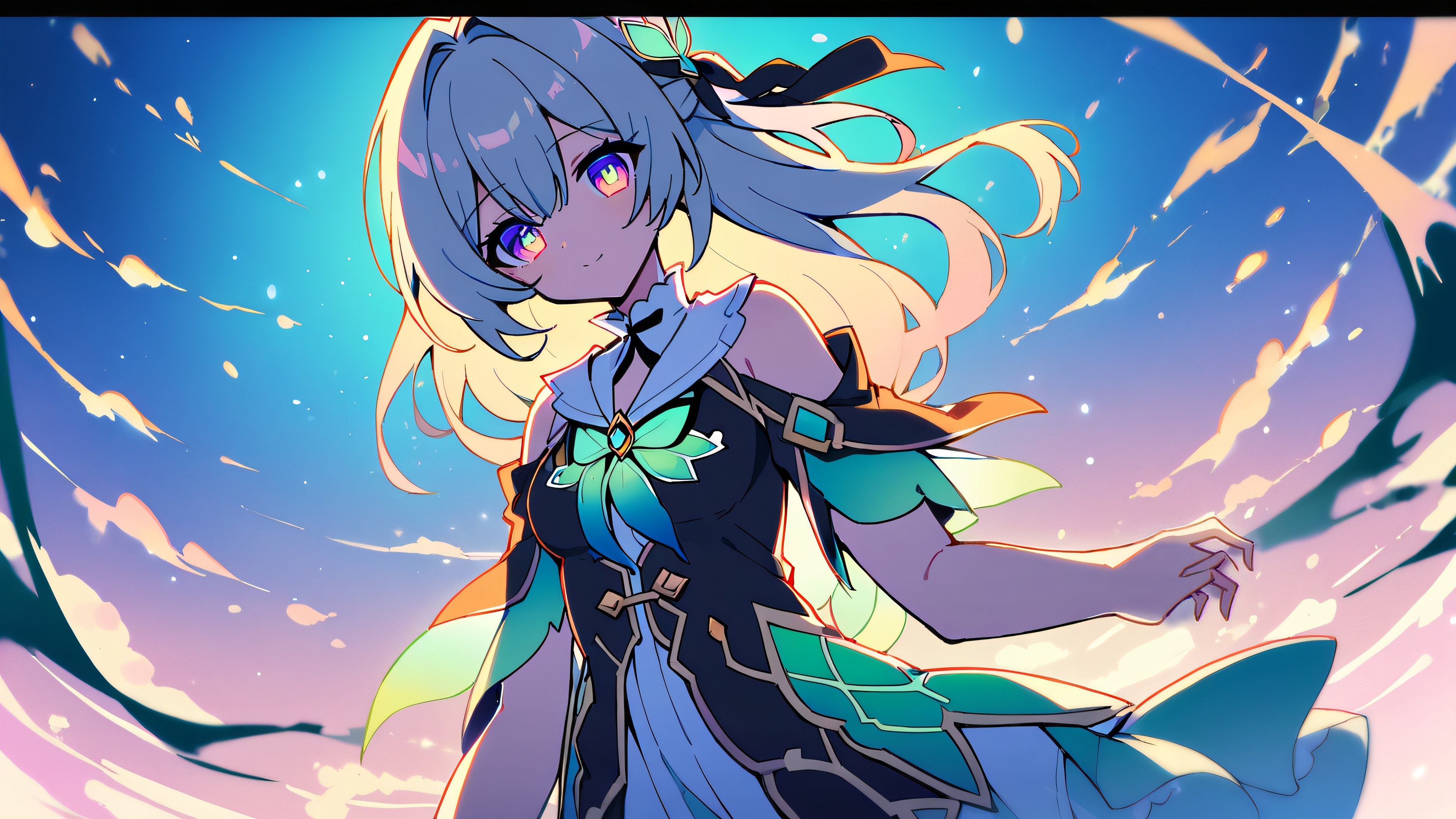 1girl, firefly, honkai: star rail, solo, masterpiece, best quality, very aesthetic, absurdres, highly detailed, looking at viewer, Perfectly clean vast pure void, extreme depth of field, Polka dot background (1.5) for added visual interest., #FF69B4, #66CCCC, #FFFF99, 16:9 aspect ratio, bright and airy, ethereal lighting, beautiful sky, cinematic lighting, vivid colors