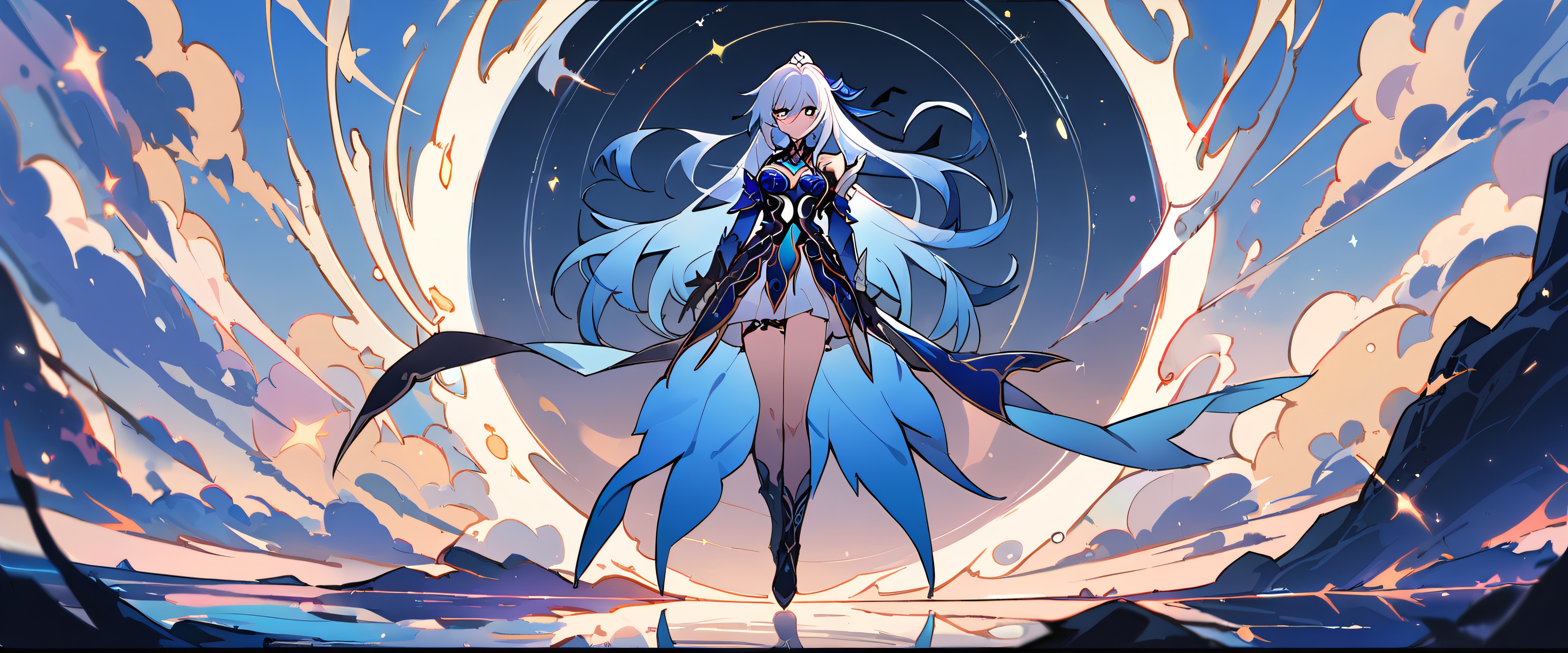 1girl, jingliu, honkai: star rail, solo, masterpiece, best quality, very aesthetic, absurdres, highly detailed, looking at viewer, Perfectly clean vast pure void, extreme depth of field, {‘dominant’: ‘White’}, 21:9 ultrawide panoramic aspect ratio, epic wide shot, bright and airy, ethereal lighting, beautiful sky, cinematic lighting, vivid colors