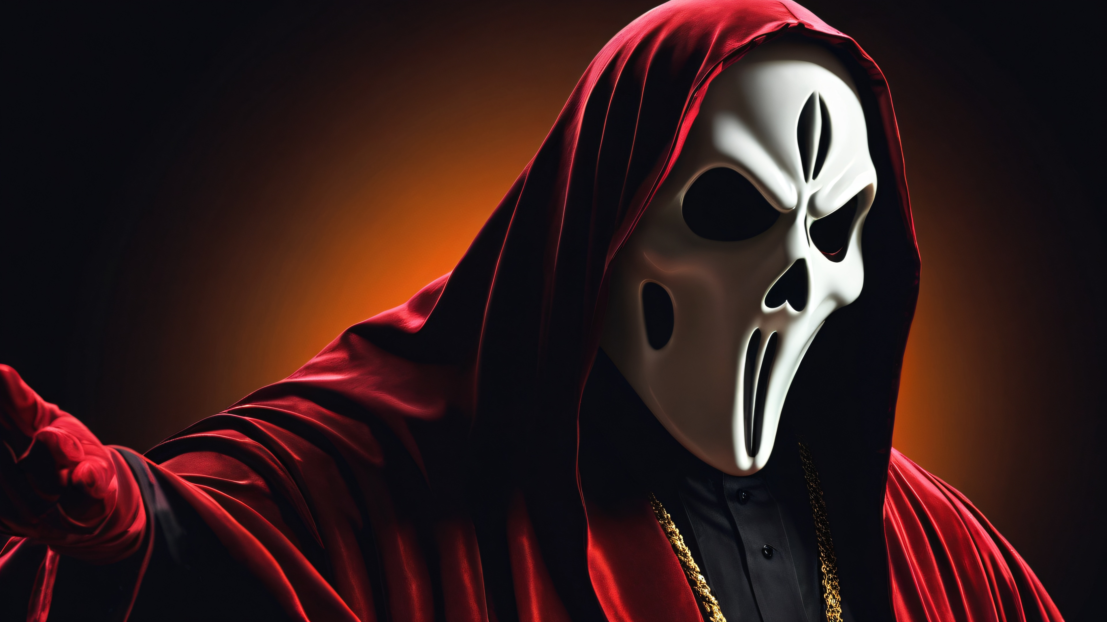 A breathtaking desktop wallpaper of Ghostface, perfectly clean vast pure void, extreme depth of field, black background, award-winning digital art, pristine clarity, Ultra graphics, minimalism, masterpiece, ETHEREAL LIGHTING: Radiant, brilliant colors, ray traced reflections, and pristine clarity. Bright and airy., [‘Dark’, ‘Black’], 16:9 aspect ratio, ethereal lighting, radiant, brilliant colors, ray traced reflections, pristine clarity, award-winning digital art, epic breathtaking scale, stunning visual impact, perfect composition, highly textured surfaces, intricate micro-details, physically based rendering, macOS wallpaper aesthetic, masterpiece, highest quality, highly detailed, 8k resolution.