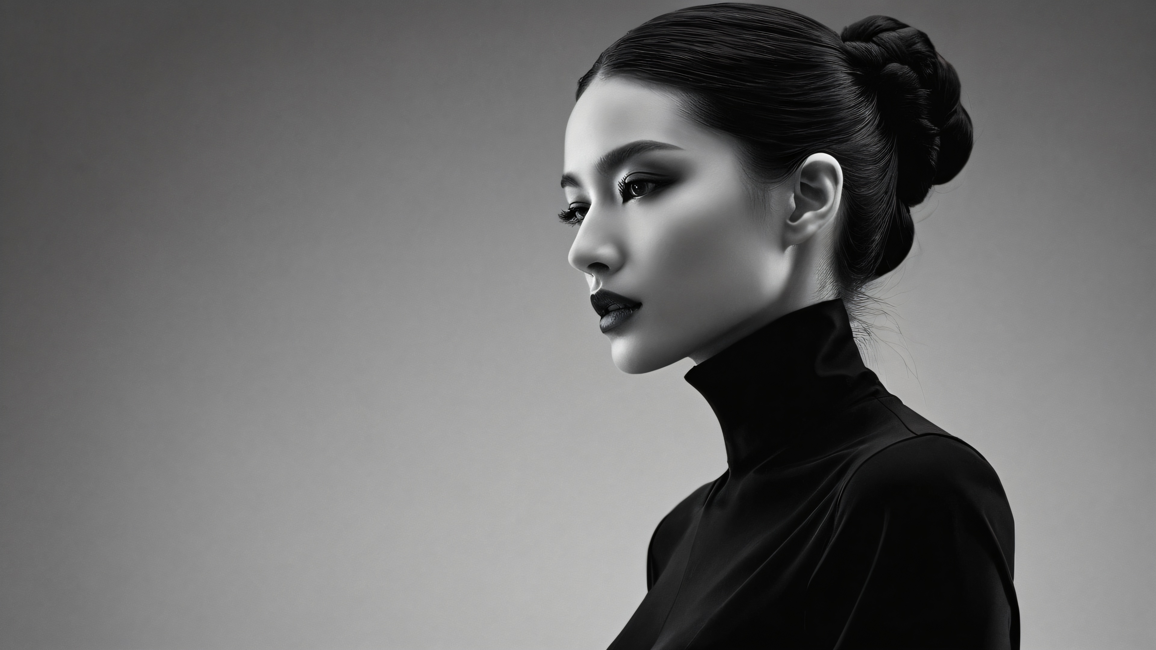 A breathtaking desktop wallpaper of woman, perfectly clean vast pure void, extreme depth of field, award-winning digital art, pristine clarity, SLEEK DARK MODE AESTHETIC. Deep perfect blacks, striking crisp contrast, and elegant luminescent accents., monochromatic color, black, 16:9 aspect ratio, elegant low-key lighting, deep perfect blacks, striking contrast, sleek dark mode aesthetic, luminescent accents, deep rich colors, award-winning digital art, epic breathtaking scale, stunning visual impact, perfect composition, highly textured surfaces, intricate micro-details, physically based rendering, macOS wallpaper aesthetic, masterpiece, highest quality, highly detailed, 8k resolution.