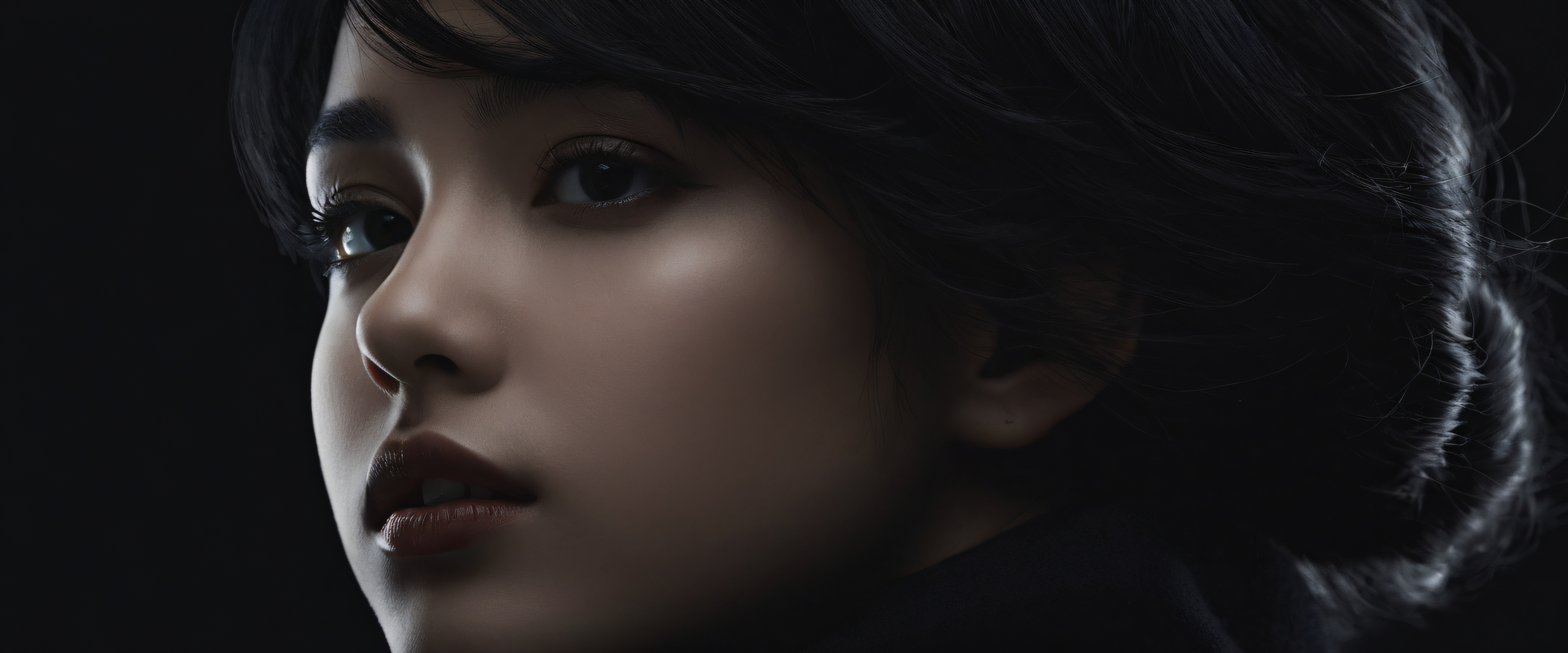 A breathtaking desktop wallpaper of 1 Girl, perfectly clean vast pure void, extreme depth of field (close-up: 1.5), award-winning digital art, pristine clarity, SLEEK DARK MODE AESTHETIC. Deep perfect blacks, striking crisp contrast, and elegant luminescent accents., Dominant color palette matching the requested mood: [neutral/nature-inspired colors], 21:9 ultrawide panoramic aspect ratio, epic wide shot, elegant low-key lighting, deep perfect blacks, striking contrast, sleek dark mode aesthetic, luminescent accents, deep rich colors, award-winning digital art, epic breathtaking scale, stunning visual impact, perfect composition, highly textured surfaces, intricate micro-details, physically based rendering, macOS wallpaper aesthetic, masterpiece, highest quality, highly detailed, 8k resolution.
