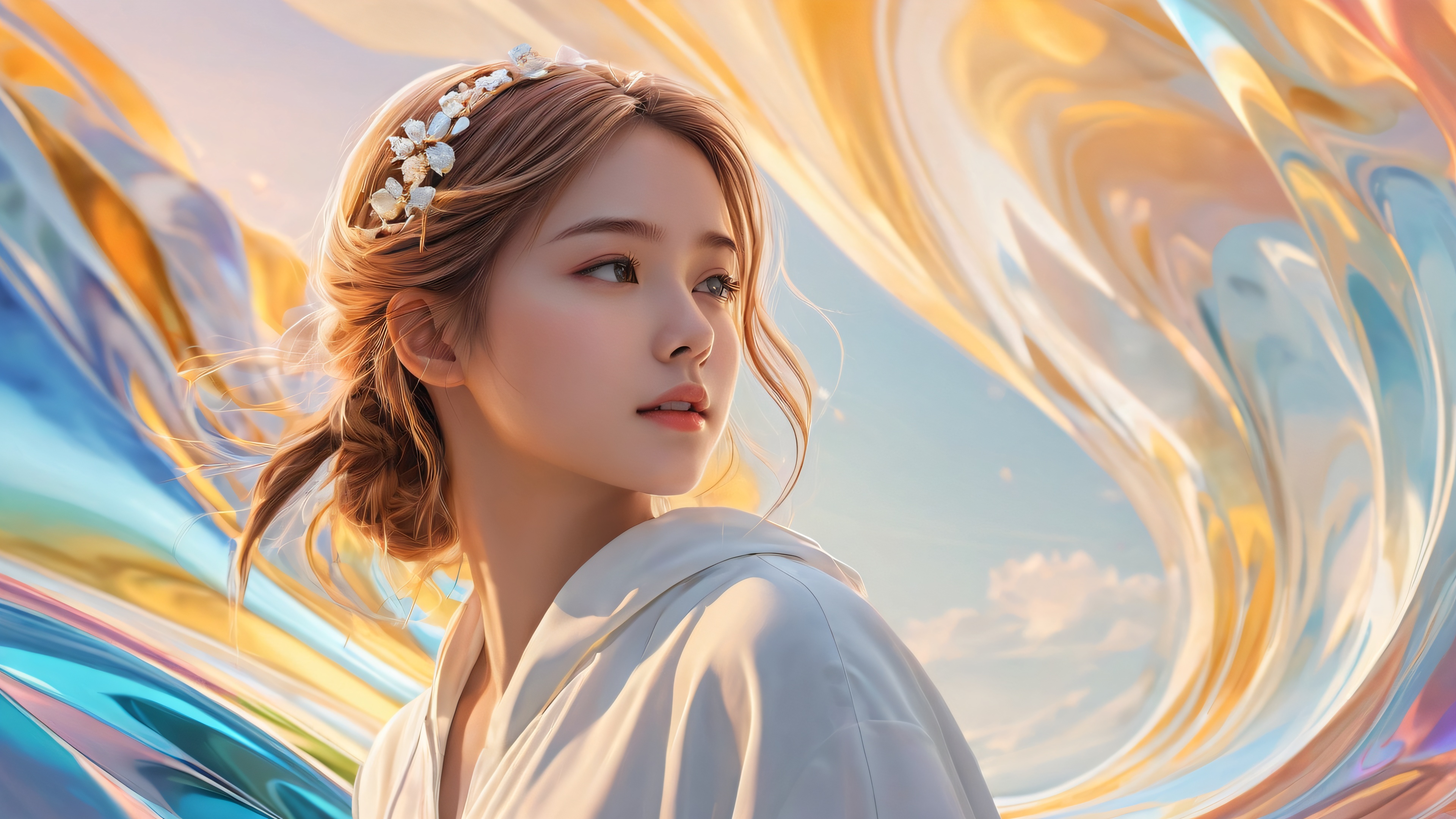 A visually stunning wallpaper featuring a girl floating in an endless expanse of pristine white, rendered with breathtaking detail and depth. The scene is bathed in radiant, brilliant colors that seem to pulse with an otherworldly energy. The lighting is ethereal, casting a soft glow across the subject’s features as if illuminated from within.