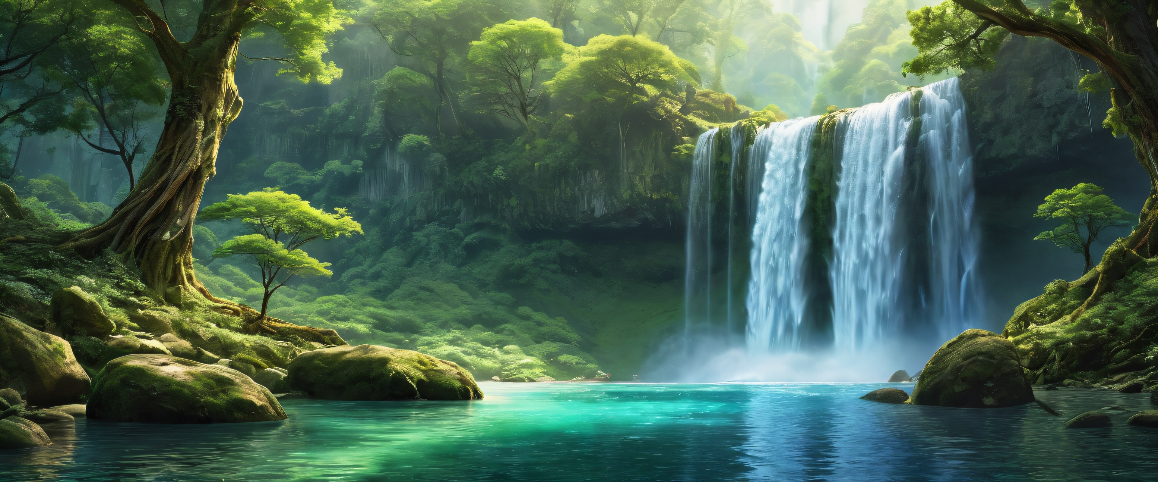 This exquisite digital artwork transports you to an otherworldly realm, where the majestic force of a waterfall cascades down a crystal-clear facade. The surrounding void is illuminated by ethereal lighting, casting an enchanting glow on the misty whites and bluish-green hues that dance around the precipice. Every detail is meticulously crafted, from the intricate micro-textures to the physically-based rendering that showcases the sheer scale of this natural wonder.