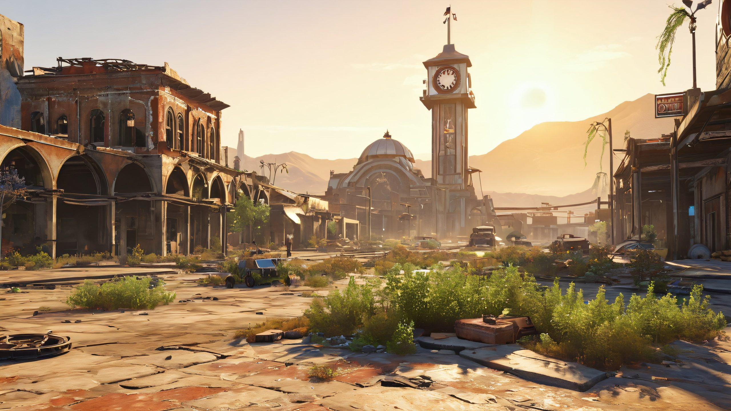 This stunning 4K desktop wallpaper depicts a rare moment of unity among the four most prominent factions in the Fallout universe. The New California Republic, the Brotherhood of Steel, the Enclave, and the Super Mutants sit together in a dusty, ruined city square, surrounded by the remnants of a once-great civilization. The scene is dominated by a large, broken clock tower, with weeds and vines snaking through its broken clock faces. The harsh, unforgiving sunlight casts long shadows across the ruined city, with a hint of golden hour warmth, as if the sun is slowly setting on the remnants of humanity.