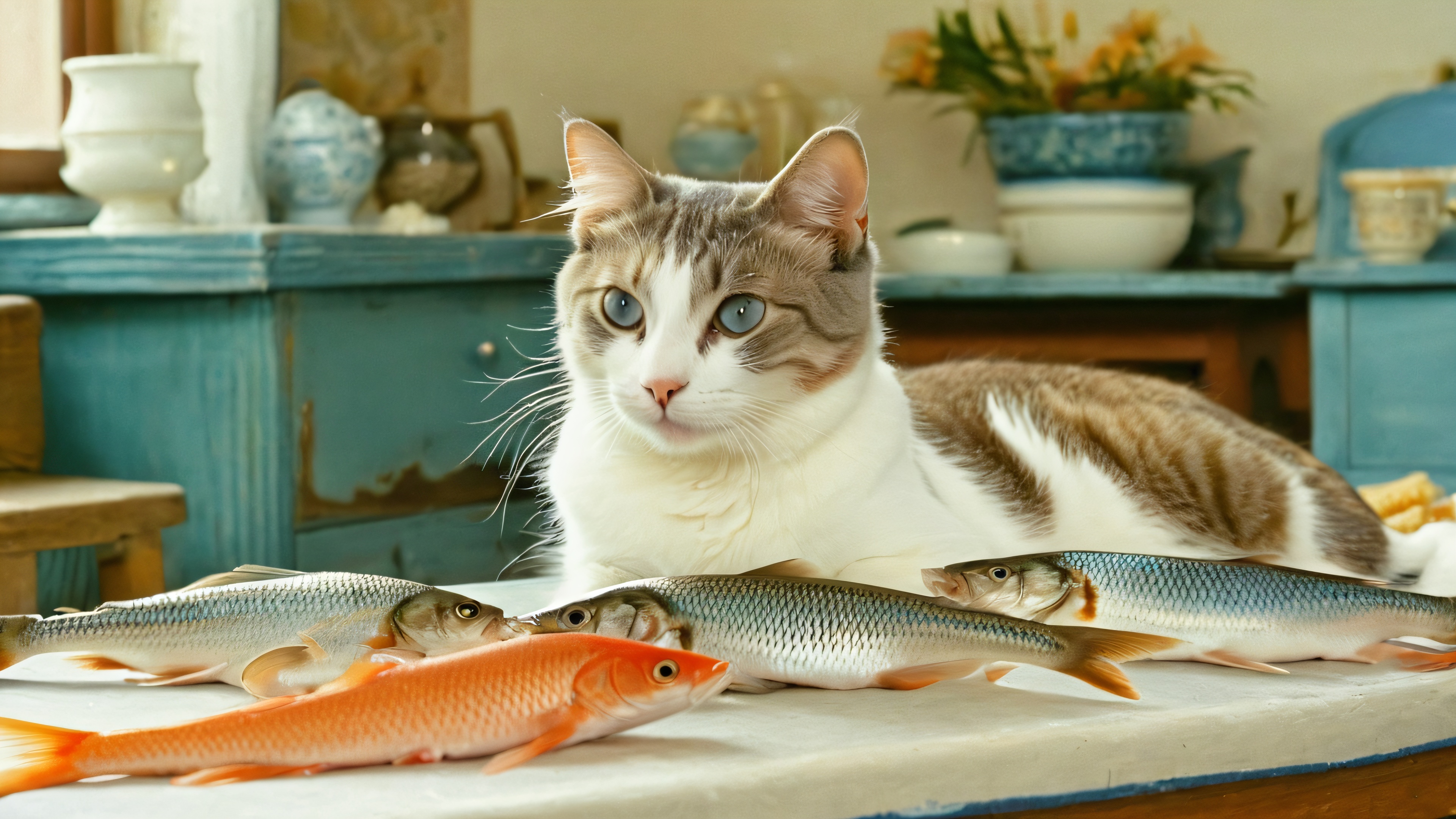 Step into the vibrant world of this stunning desktop wallpaper, where a curious cat savors the delight of a fish market. Warm browns and deep blues evoke a sense of serenity as sunlight filters through the scene, casting subtle shadows. The photorealistic masterpiece boasts organic film grain and physical camera imperfections, giving it an authentic Kodak Portra 400 feel.