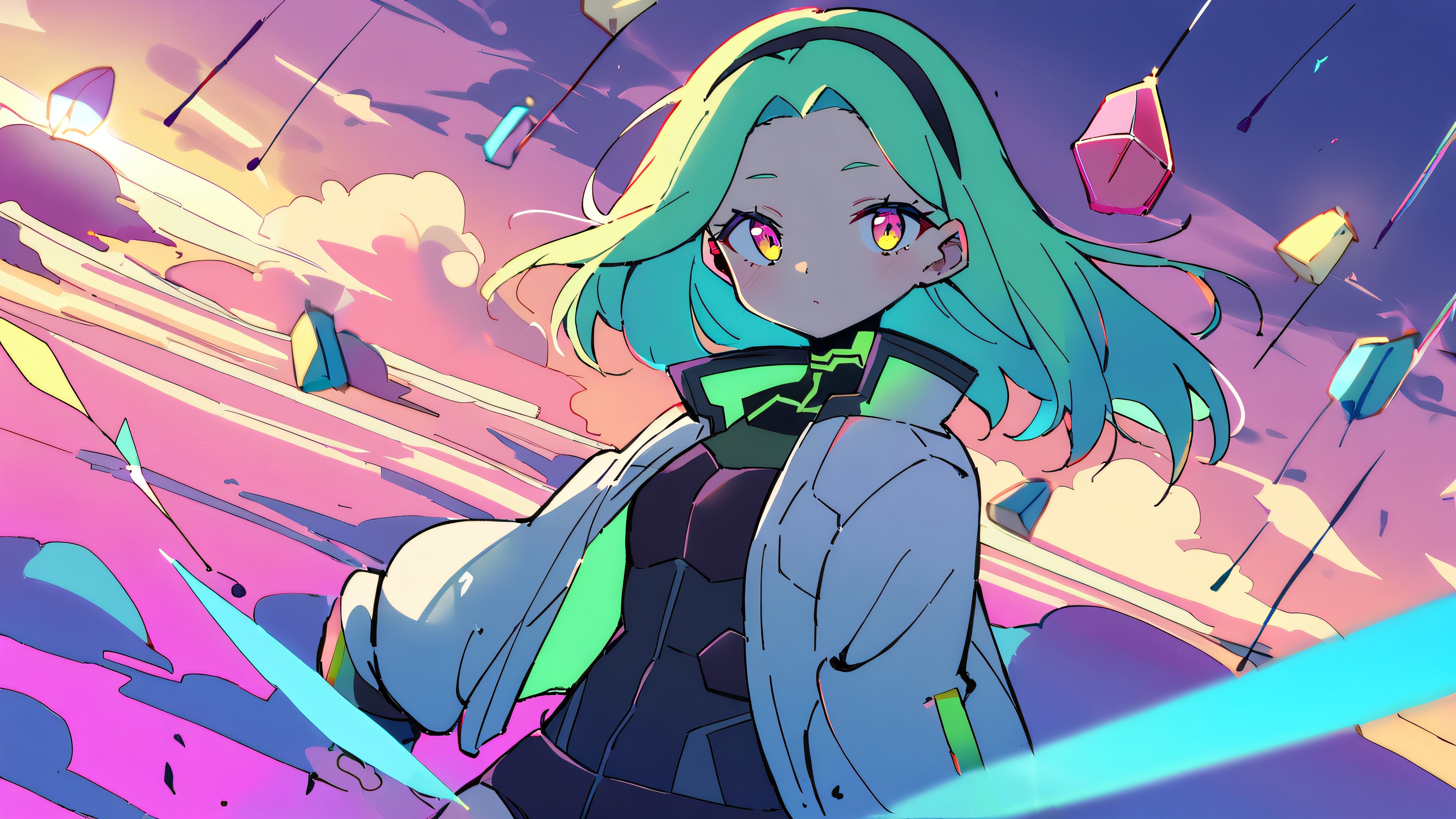 This mesmerizing wallpaper captures the essence of cyberpunk solitude. Rebecca, the protagonist, stands majestically amidst an expansive, cloud-dotted expanse, bathed in ethereal lighting that imbues a sense of serenity. The distant hum of atmospheric wind chimes adds a subtle layer of depth and complexity to the scene. The vivid colors and cinematic lighting create a bright and airy atmosphere, perfect for those seeking a visually stunning desktop backdrop.
