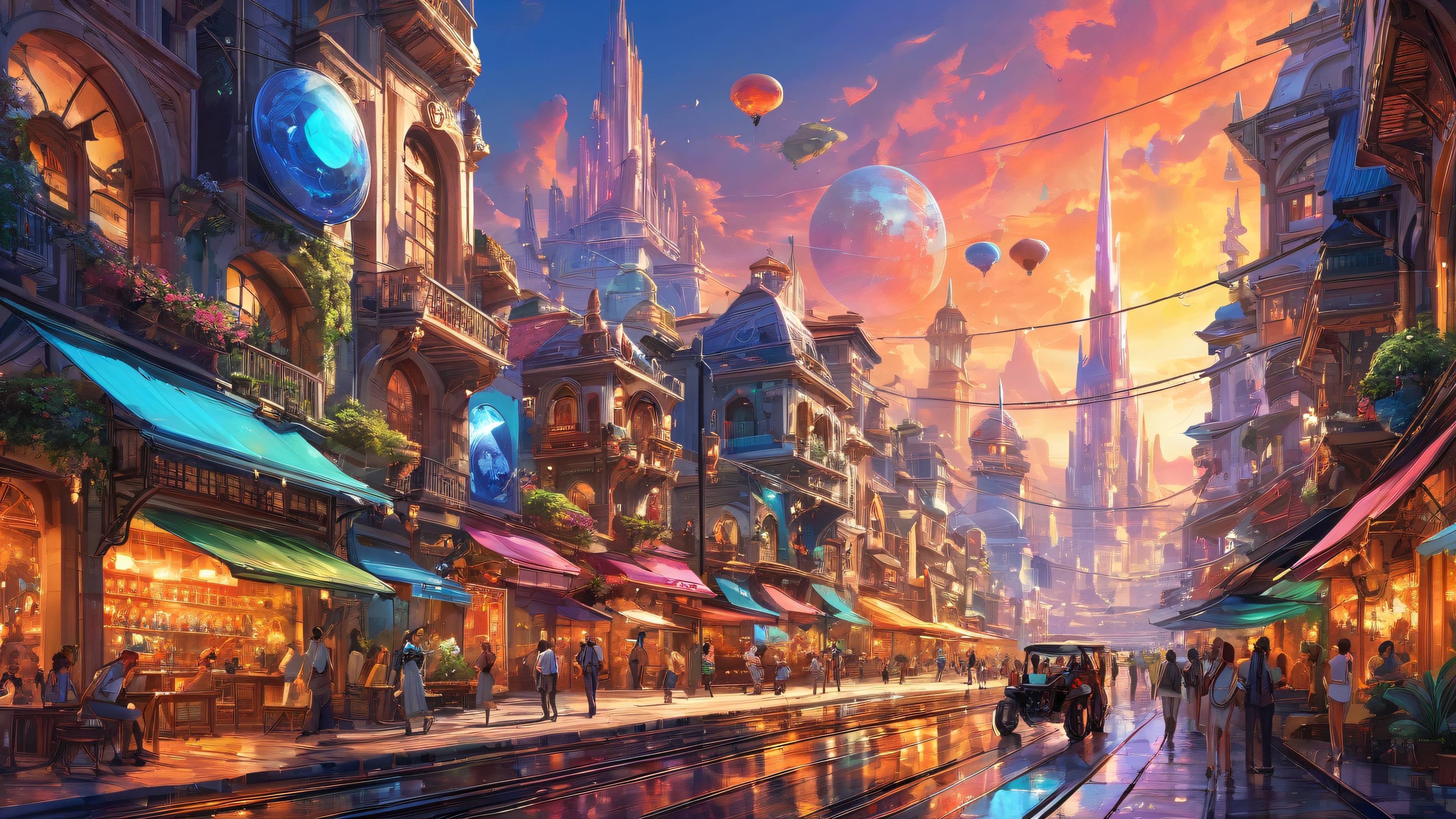 A breathtakingly beautiful desktop wallpaper featuring award-winning digital art, perfectly capturing the essence of an ethereal cyberpunk dawn. The scene is set against a pristine backdrop of extreme depth of field, with city lights shining bright and airy amidst the vastness. Radiant, brilliant colors and ray-traced reflections come together to create a masterpiece that exudes stunning visual impact.