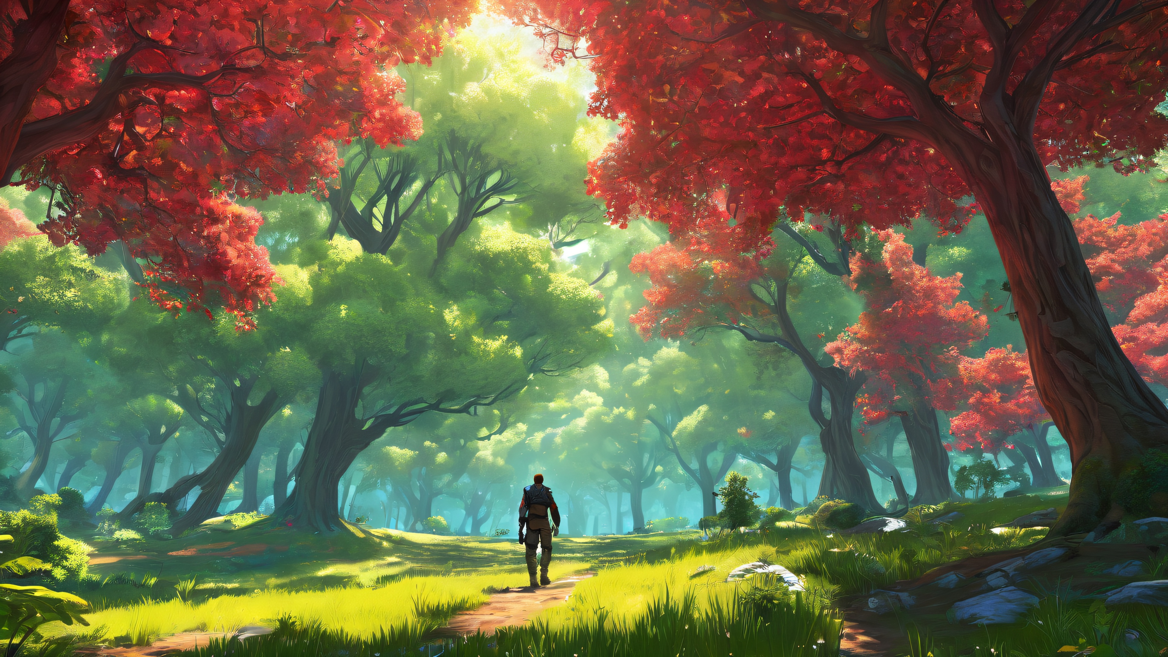 Immerse yourself in the heart of an otherworldly forest, where vibrant crimson hues blend seamlessly with deep greens. La scène est baignée de rayonnement, brilliant colors, with ray-traced reflections that create a sense of depth and dimensionality. The composition is perfect, with highly textured surfaces and intricate micro-details that invite exploration.