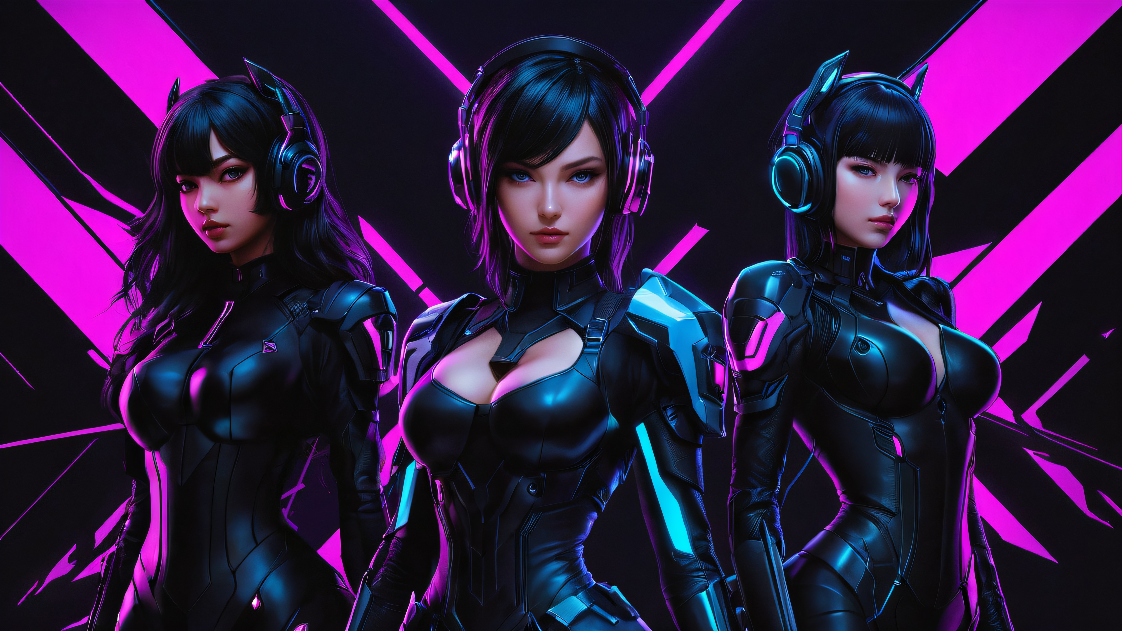 Un fond d'écran à couper le souffle de {‘main_focus’: ‘video game girls’}, parfaitement propre vaste vide pur, profondeur de champ extrême, art numérique primé, clarté immaculée, SLEEK DARK MODE AESTHETIC. Des noirs profonds et parfaits, contraste saisissant, et d'élégants accents luminescents., {‘dominant_palette’: [‘Cyan’, ‘Pink’, ‘Purple’]}, 16:9 rapport hauteur/largeur, éclairage discret et élégant, noirs profonds et parfaits, contraste saisissant, esthétique élégante du mode sombre, accents luminescents, couleurs riches et profondes, art numérique primé, échelle épique à couper le souffle, impact visuel époustouflant, composition parfaite, surfaces très texturées, micro-détails complexes, rendu basé sur la physique, Esthétique du fond d'écran macOS, chef-d'œuvre, la plus haute qualité, très détaillé, 8k résolution.