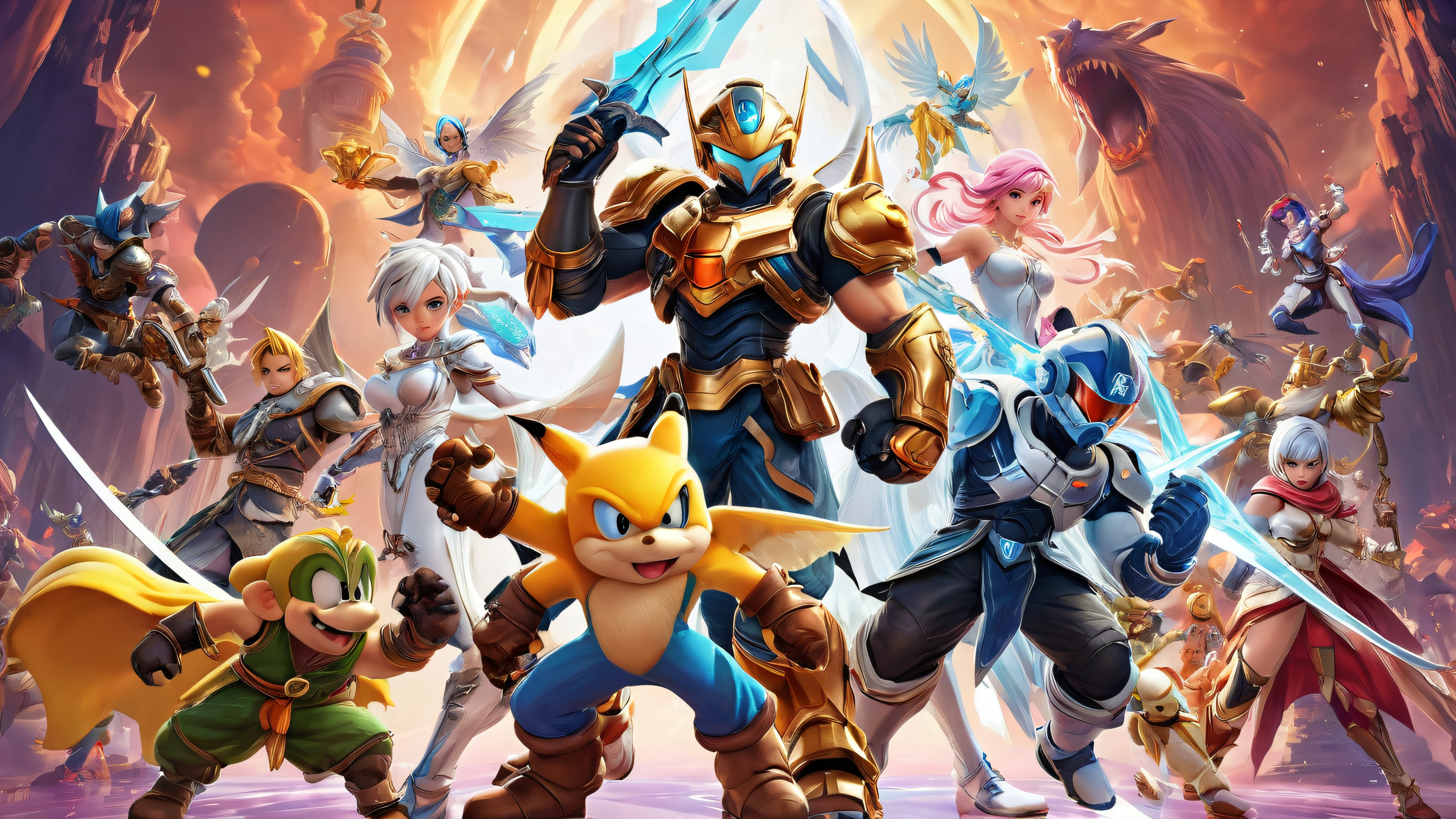 A breathtaking desktop wallpaper of Video Game Characters, Perfectly clean vast pure void, extreme depth of field, Award-winning digital art, clarté immaculée, Ethereal lighting with radiant brilliant colors, ray traced reflections and pristine clarity. Bright and airy., #0000FF, 16:9 rapport hauteur/largeur, éclairage éthéré, radiant, brilliant colors, réflexions tracées par rayons, clarté immaculée, award-winning digital art, epic breathtaking scale, stunning visual impact, perfect composition, highly textured surfaces, intricate micro-details, physically based rendering, macOS wallpaper aesthetic, chef-d'œuvre, highest quality, highly detailed, 8k resolution.