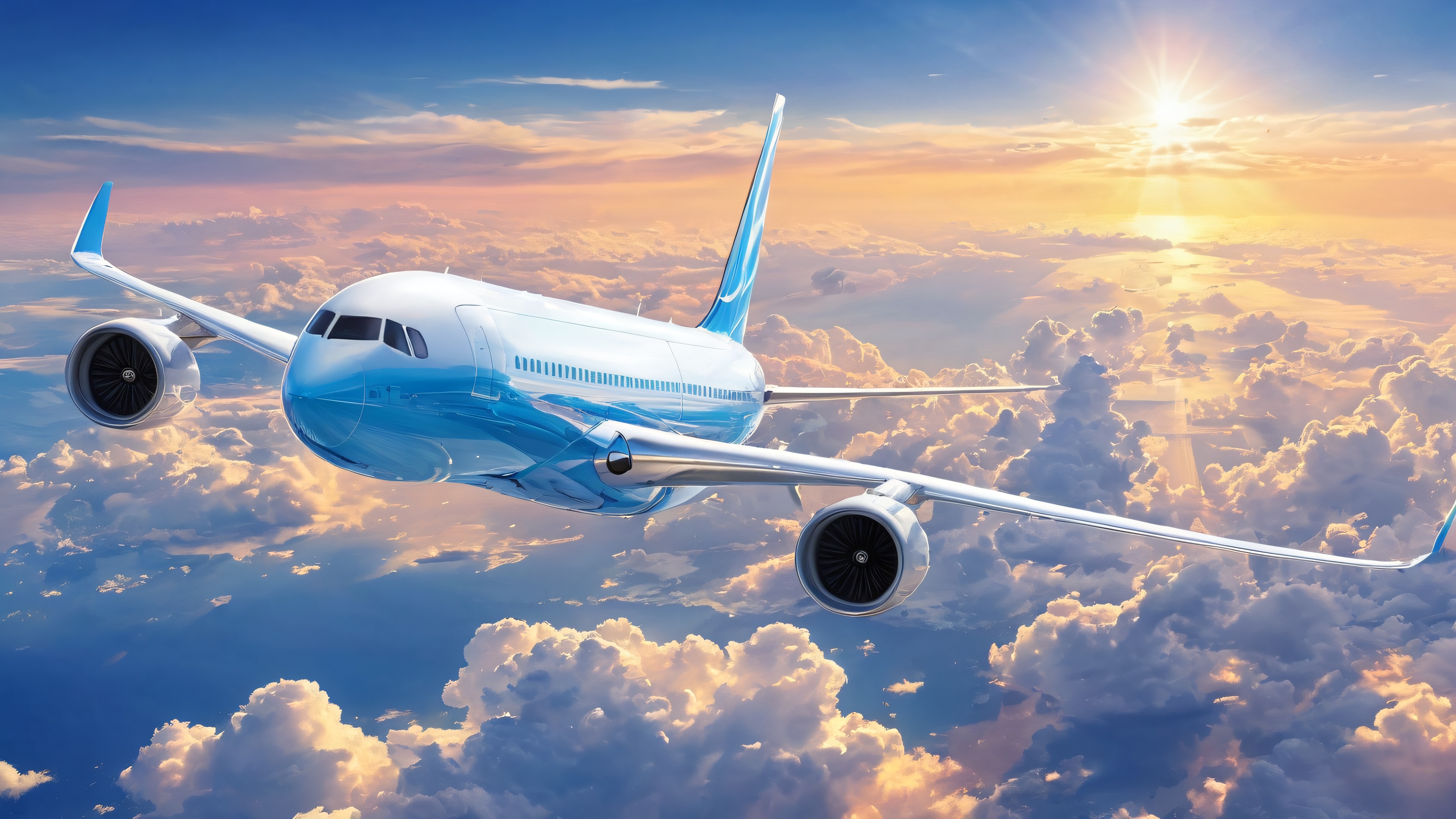 Breathtaking aerial scenery captures the essence of sunlight as it rises over a vast, pur vide. The airplane’s sleek design is juxtaposed against the endless blue expanse, where fluffy clouds drift lazily across the frame. Ray-traced reflections on the aircraft’s surface add an extra layer of depth and visual interest.