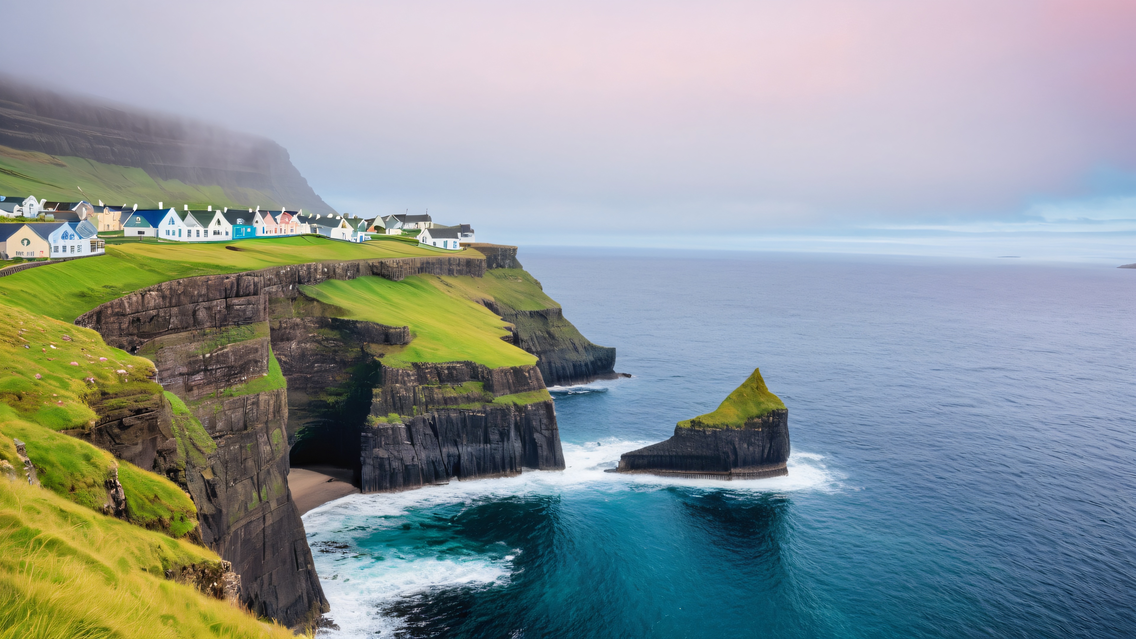 This stunning 4K image captures the breathtaking beauty of a misty morning on the Faroe Islands. The scene is set against a backdrop of layered cliffs, hidden coves, and dramatic sea stacks, with a serene village perched on a rocky outcrop. Rustic cottages and a charming church are adorned with smoke rising from their chimneys, while the air is crisp and cool, filled with the scent of saltwater and seaweed.