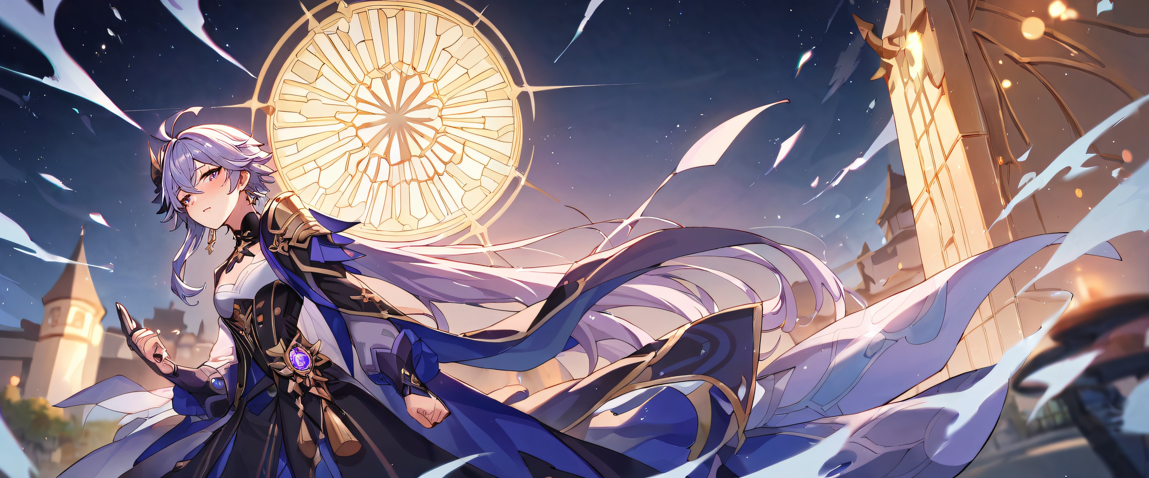 score_9, score_8_up, score_7_up, source_anime, Furina (Genshin Impact), perfectly clean vast pure void, extreme depth of field, Bluish-purple hues, stunning anime illustration, chef-d'œuvre, best quality, highly detailed, 8k resolution, 21:9 ultrawide panoramic aspect ratio, epic wide shot, elegant low-key lighting, contraste saisissant, deep perfect blacks, night scene, cinematic atmosphere