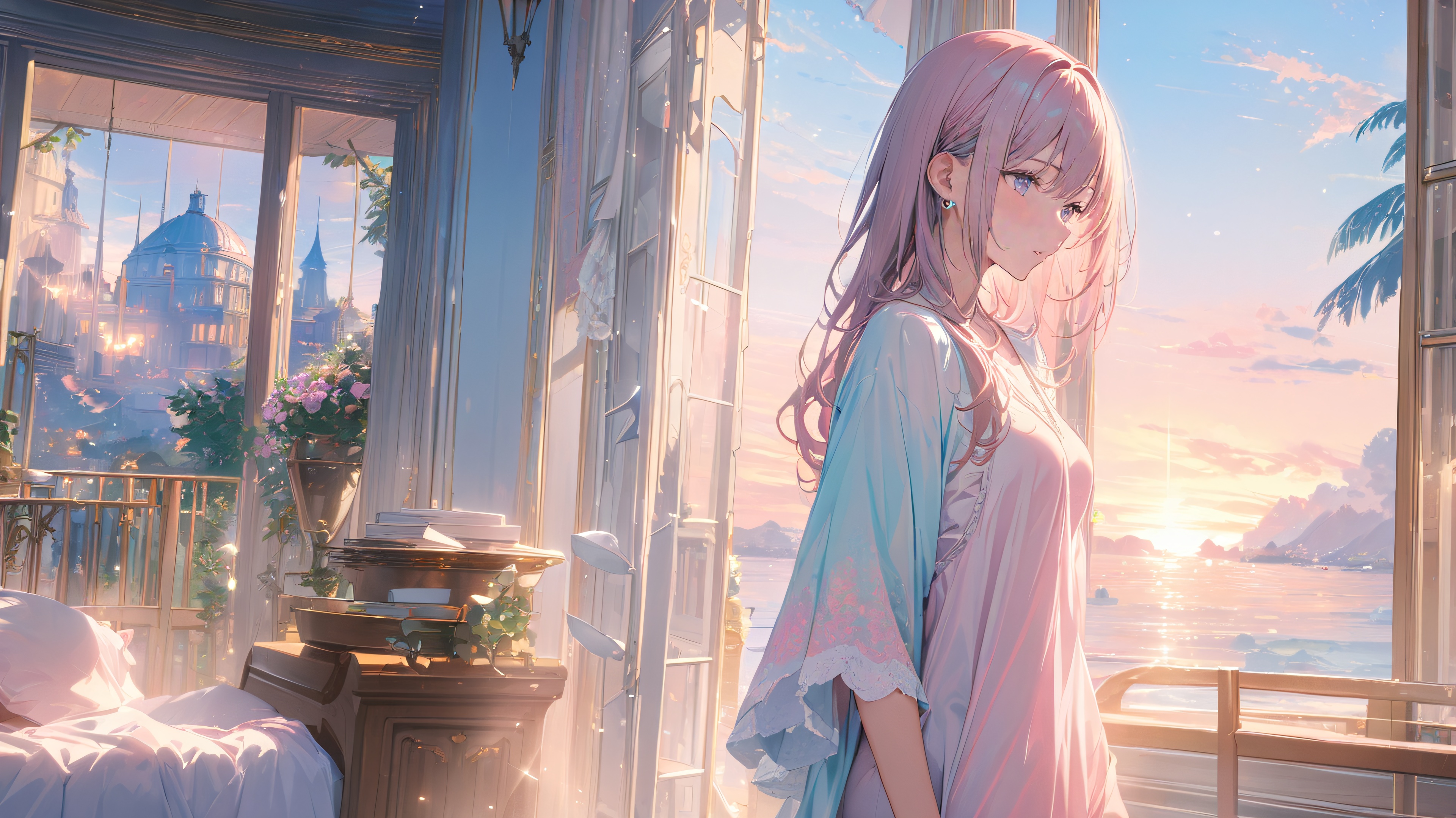 This stunning 4K wallpaper showcases a beautifully lit indoor setting, where a woman is mesmerized by her own artistic creation. The soft glow of the lamps and the subtle play of light on the surrounding objects create a warm and inviting atmosphere.