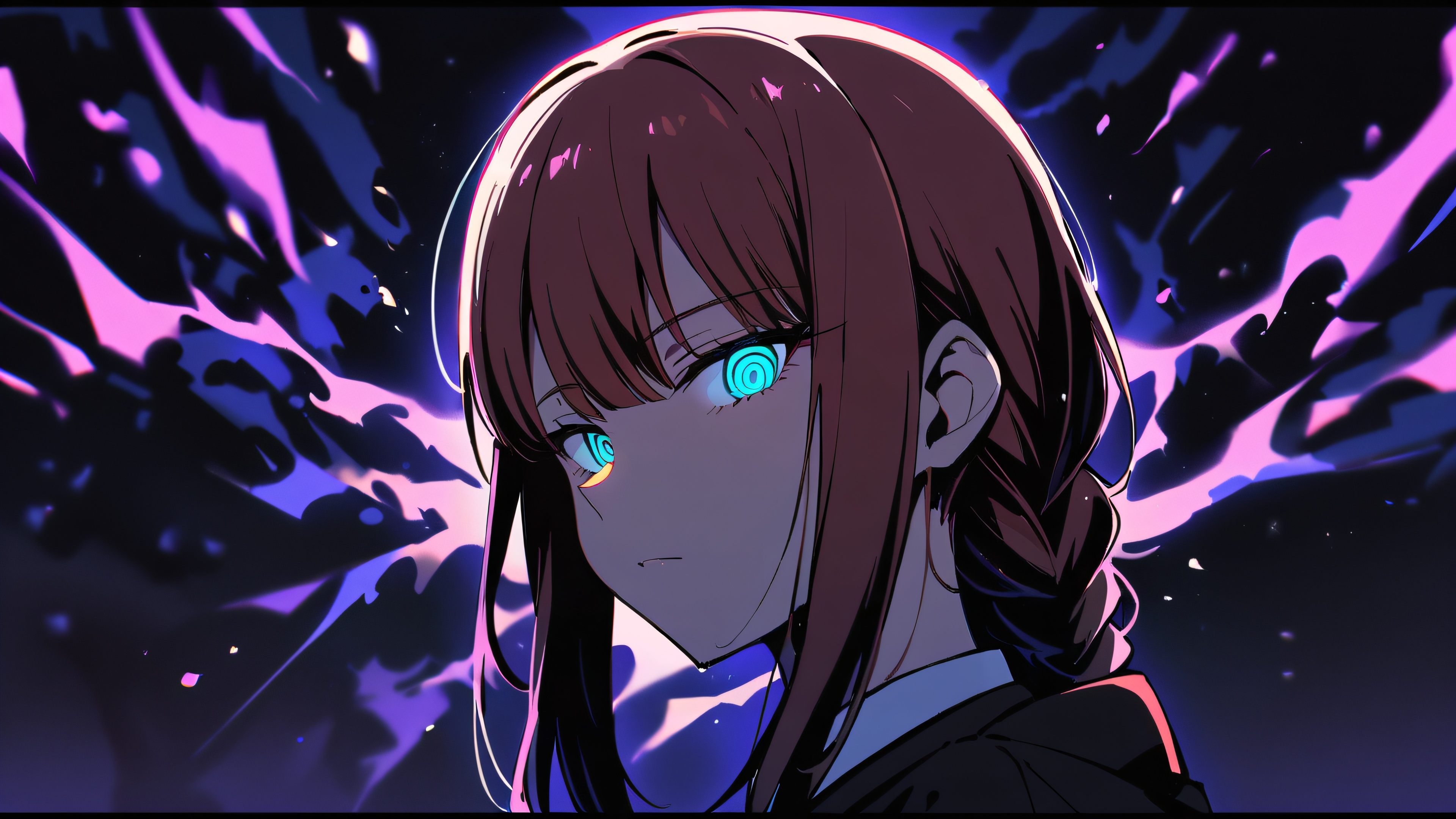 1girl, makima, chainsaw man, solo, chef-d'œuvre, best quality, very aesthetic, absurdres, très détaillé, looking at viewer, parfaitement propre vaste vide pur, profondeur de champ extrême, [‘blue’, ‘white’], 16:9 rapport hauteur/largeur, elegant low-key lighting, contraste saisissant, deep perfect blacks, night scene, glowing lights, dramatic shadows