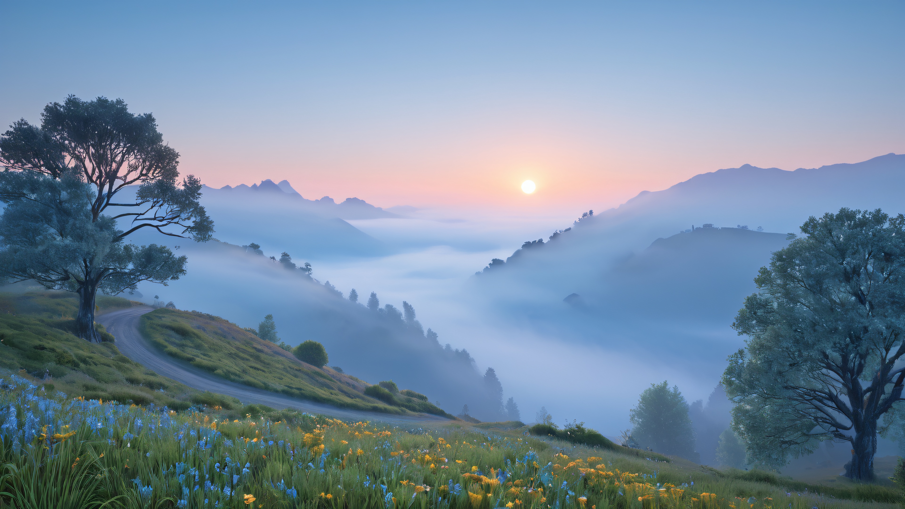 A breathtaking 4K desktop wallpaper featuring unreal shapes emerging from the misty morning atmosphere, painted with photo-realistic detail. The soft grey and blue hues evoke a sense of serenity as the day breaks.