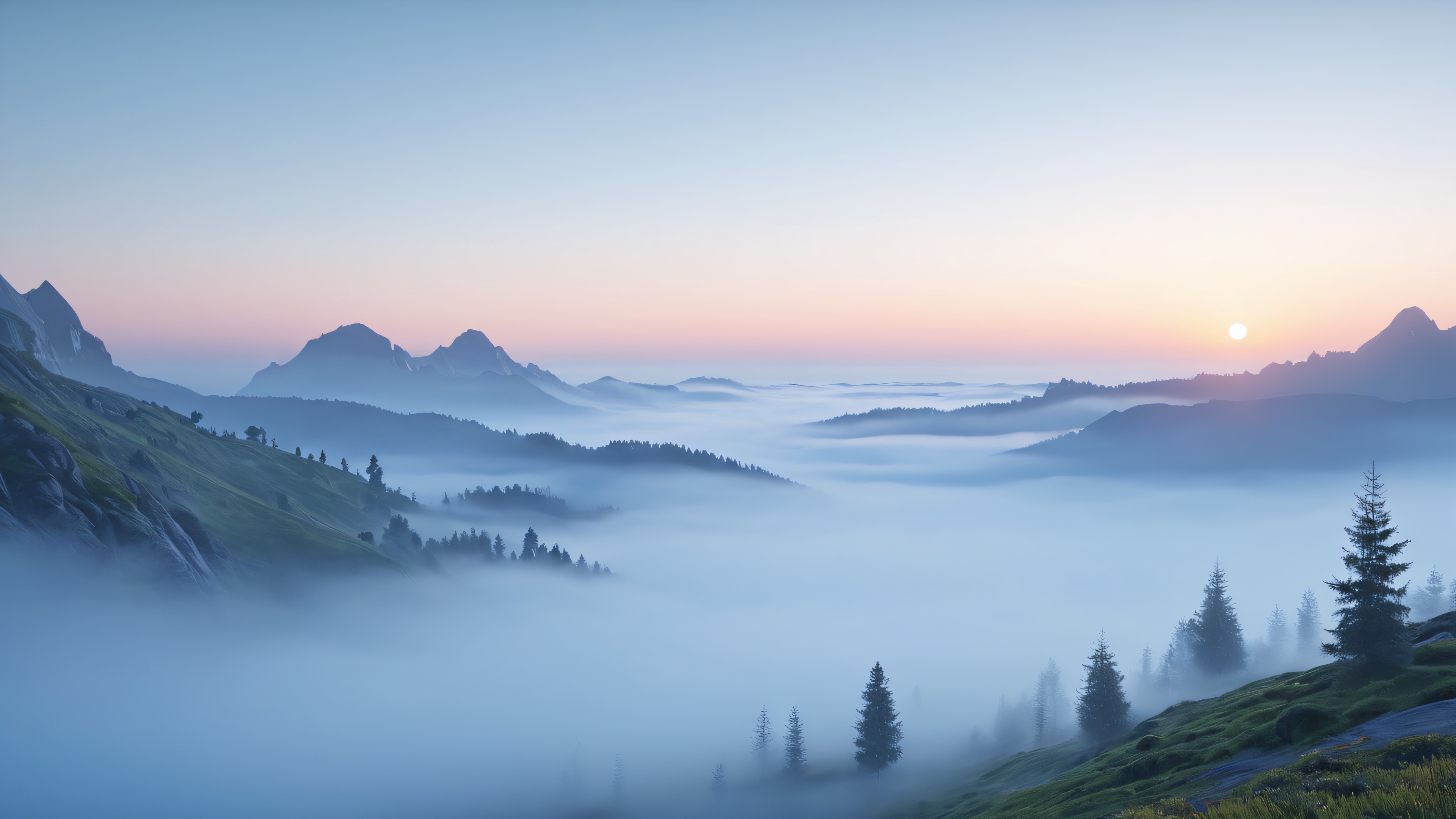 This breathtaking 4K wallpaper features a mystical scene where intricate, photo-realistic shapes emerge from the foggy morning mist. Soft grey and blue hues dominate the palette, creating an atmosphere of tranquility and mystery.