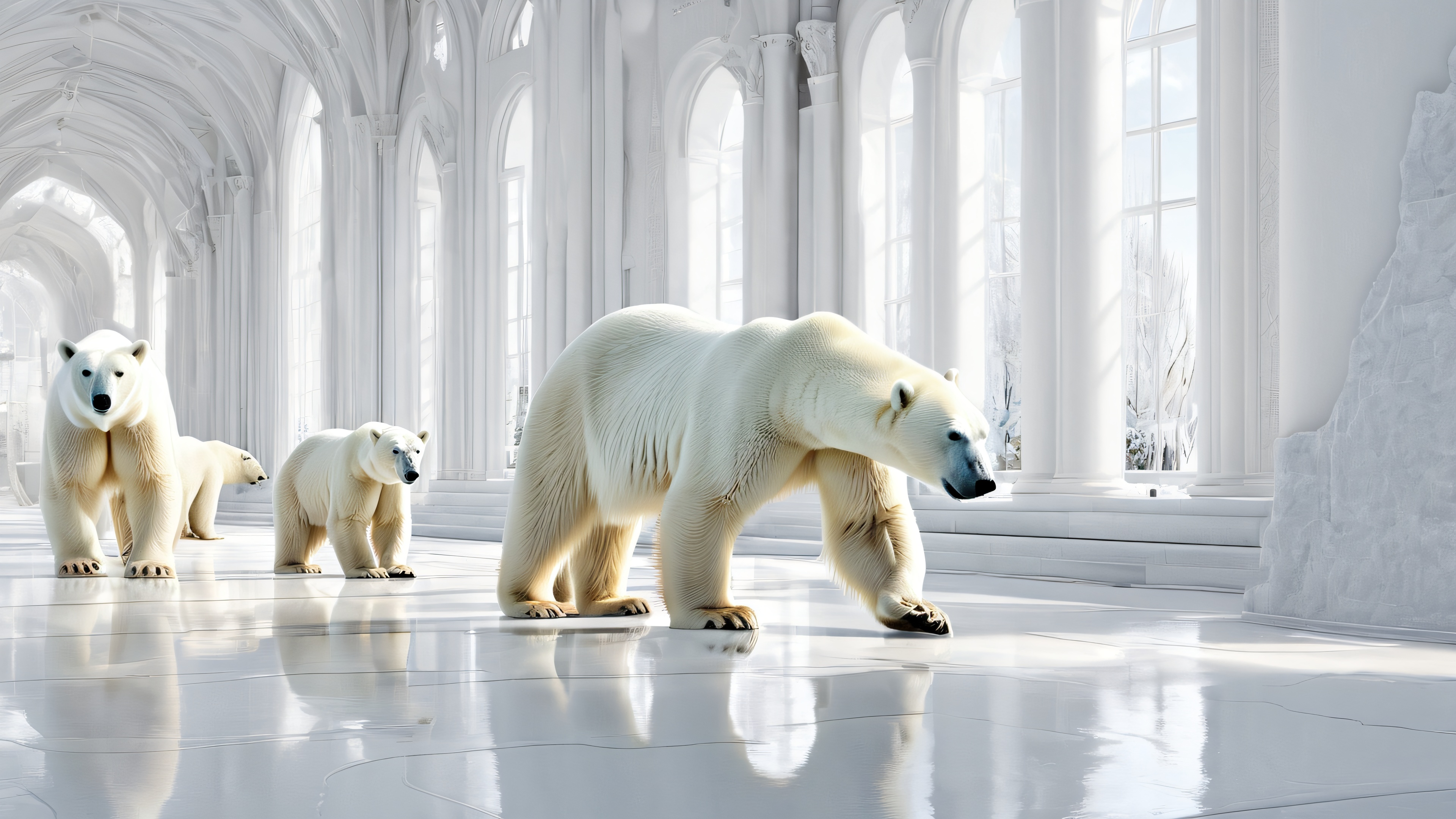 Desktop/PC wallpaper featuring polar bears in a vast, pure void with ethereal lighting and radiant colors.