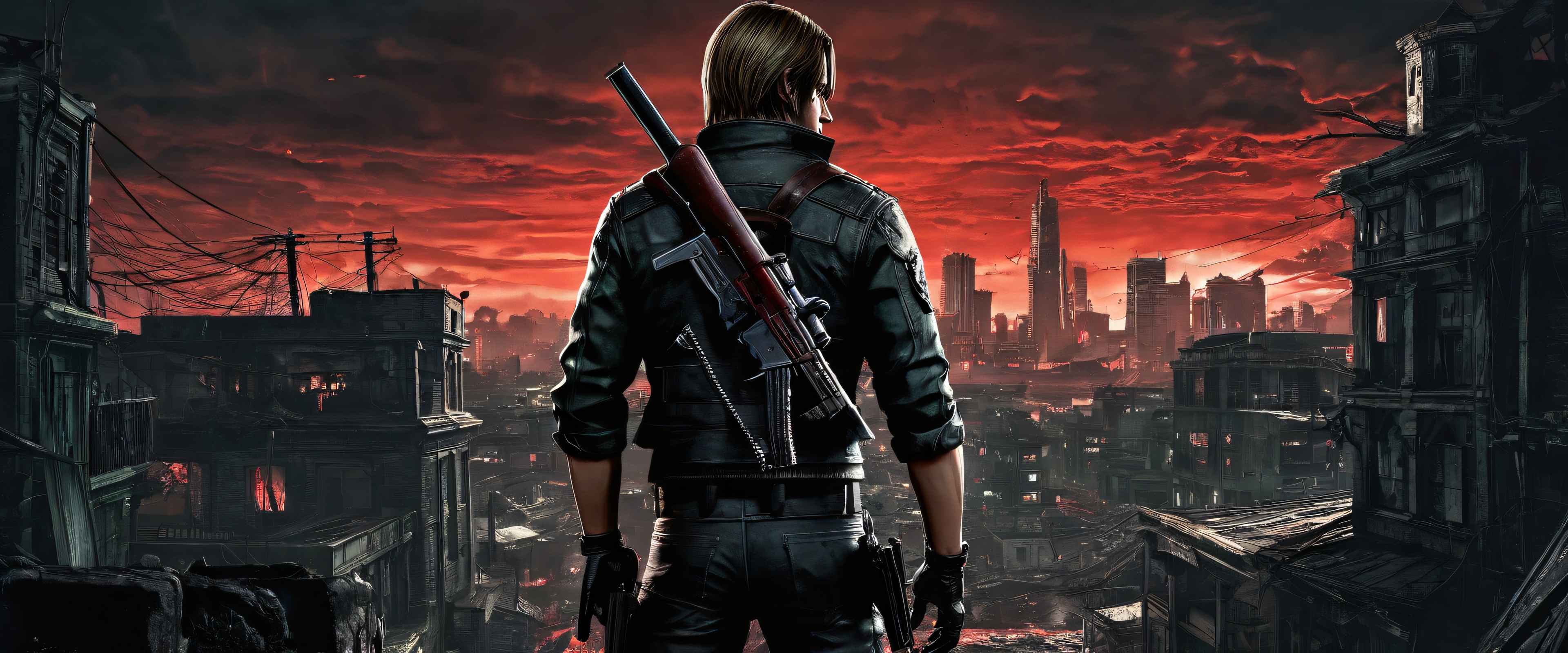 A breathtaking ultrawide panoramic wallpaper featuring Leon Kennedy in the midst of a desolate, void-like environment. The scene is bathed in an otherworldly glow, casting long shadows across the pristine surface. Radiant colors and ray-traced reflections add depth and dimensionality to the stark setting. A hint of Raccoon City’s dark atmosphere lingers, evoking feelings of survival-horror dread.