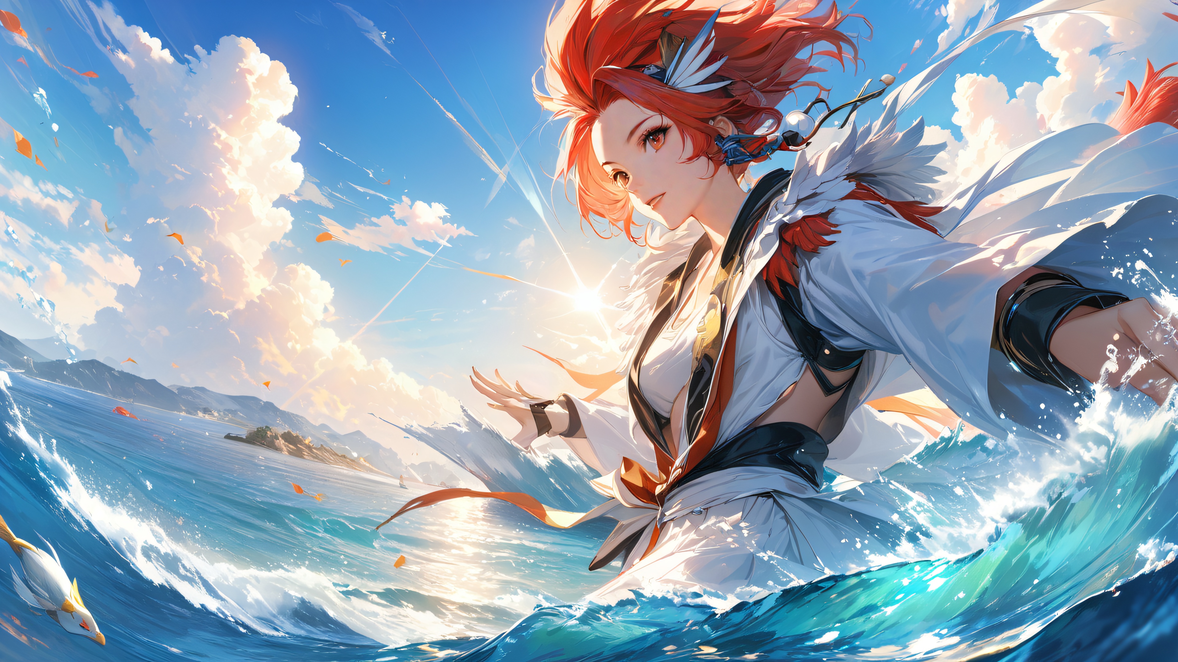 This stunning digital painting showcases the vibrant colors and intricate details of the Rooster Fighter universe. The bright blue sky is filled with fluffy clouds, while the calm waters reflect the sun’s rays in a mesmerizing display of light and texture. Every element, from the charactersexpressions to the subtle ripples on the water, is meticulously rendered to create an immersive visual experience.