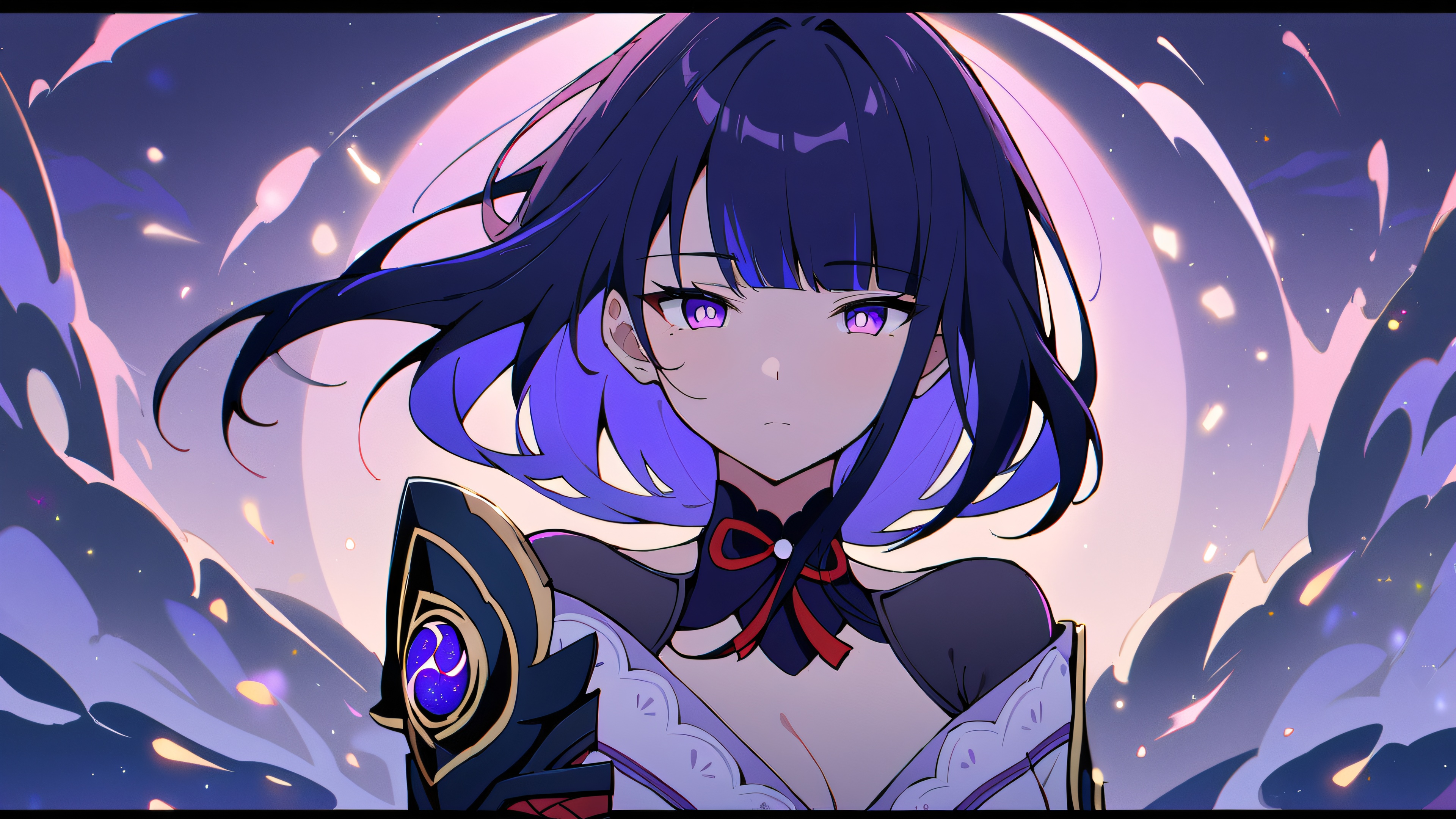 1girl, raiden shogun, genshin impact, solo, chef-d'œuvre, best quality, very aesthetic, absurdres, très détaillé, looking at viewer, A perfectly clean vast pure void with extreme depth of field and a subtle plaid background, #F2C464 #8BC34A #FFFFFF, 16:9 rapport hauteur/largeur, bright and airy, éclairage éthéré, beautiful sky, cinematic lighting, vivid colors