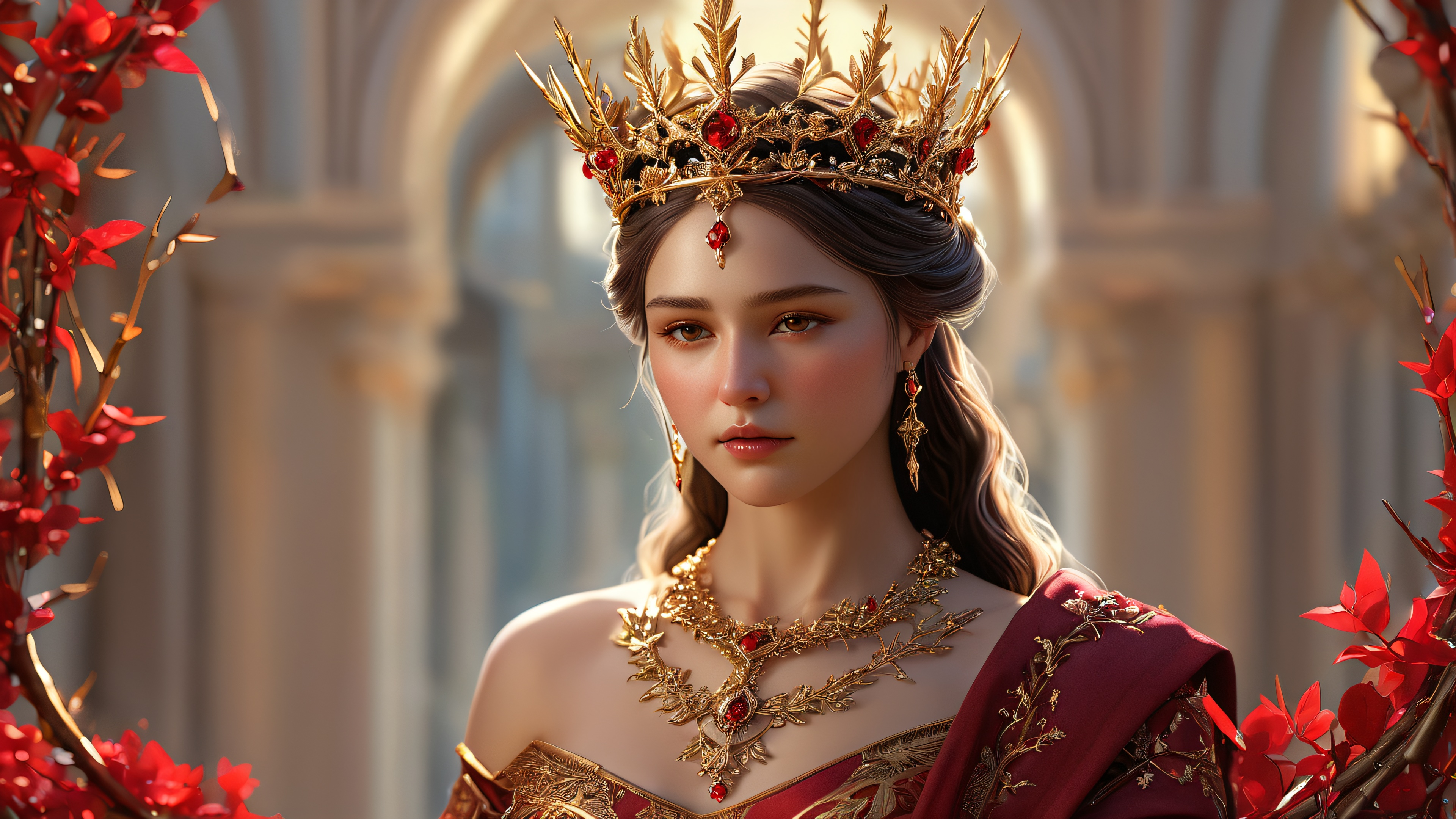 Immerse yourself in this breathtaking 8K wallpaper featuring an ornate golden crown crafted from thorns, suspended against a backdrop of deep crimson hues. The ethereal lighting and brilliant colors create a sense of radiant depth, while the ray-traced reflections add a touch of pristine clarity. This masterpiece of digital art boasts intricate details and high-textured surfaces, making it a stunning addition to any desktop.