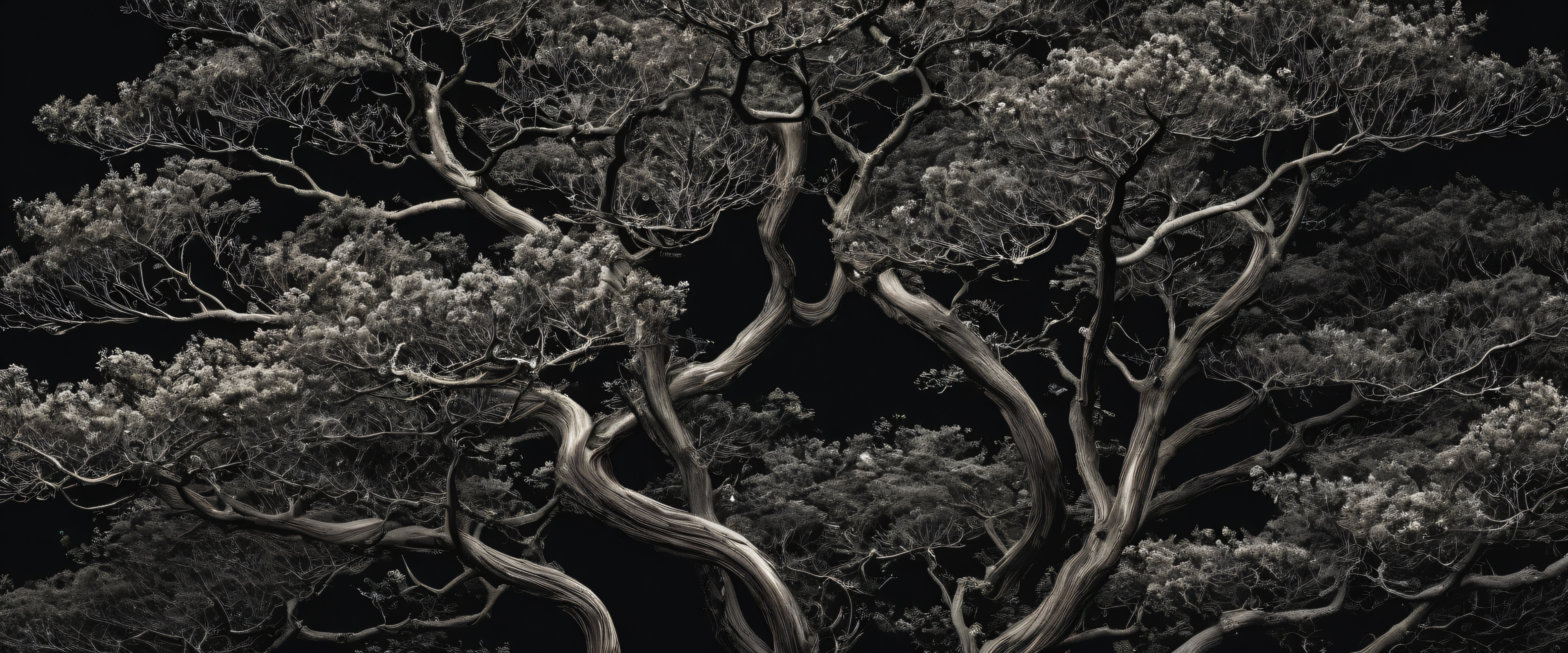 A breathtaking desktop wallpaper of Trees and Branch, A perfectly clean vast pure void, profondeur de champ extrême, allowing the trees to pop against the subtle gradient, Award-winning digital art with pristine clarity, showcasing intricate textures and details, Sleek Dark Mode Aesthetic: Des noirs profonds et parfaits, contraste saisissant, and elegant luminescent accents highlighting the textures and patterns, {‘dominant’: ‘#8B4513’, ‘palette’: [‘Earth Tones’, ‘Warm Neutrals’]}, 21:9 rapport d'aspect panoramique ultra-large, plan large épique, éclairage discret et élégant, noirs profonds et parfaits, contraste saisissant, esthétique élégante du mode sombre, accents luminescents, couleurs riches et profondes, art numérique primé, échelle épique à couper le souffle, impact visuel époustouflant, composition parfaite, surfaces très texturées, micro-détails complexes, rendu basé sur la physique, Esthétique du fond d'écran macOS, chef-d'œuvre, la plus haute qualité, très détaillé, 8k résolution.
