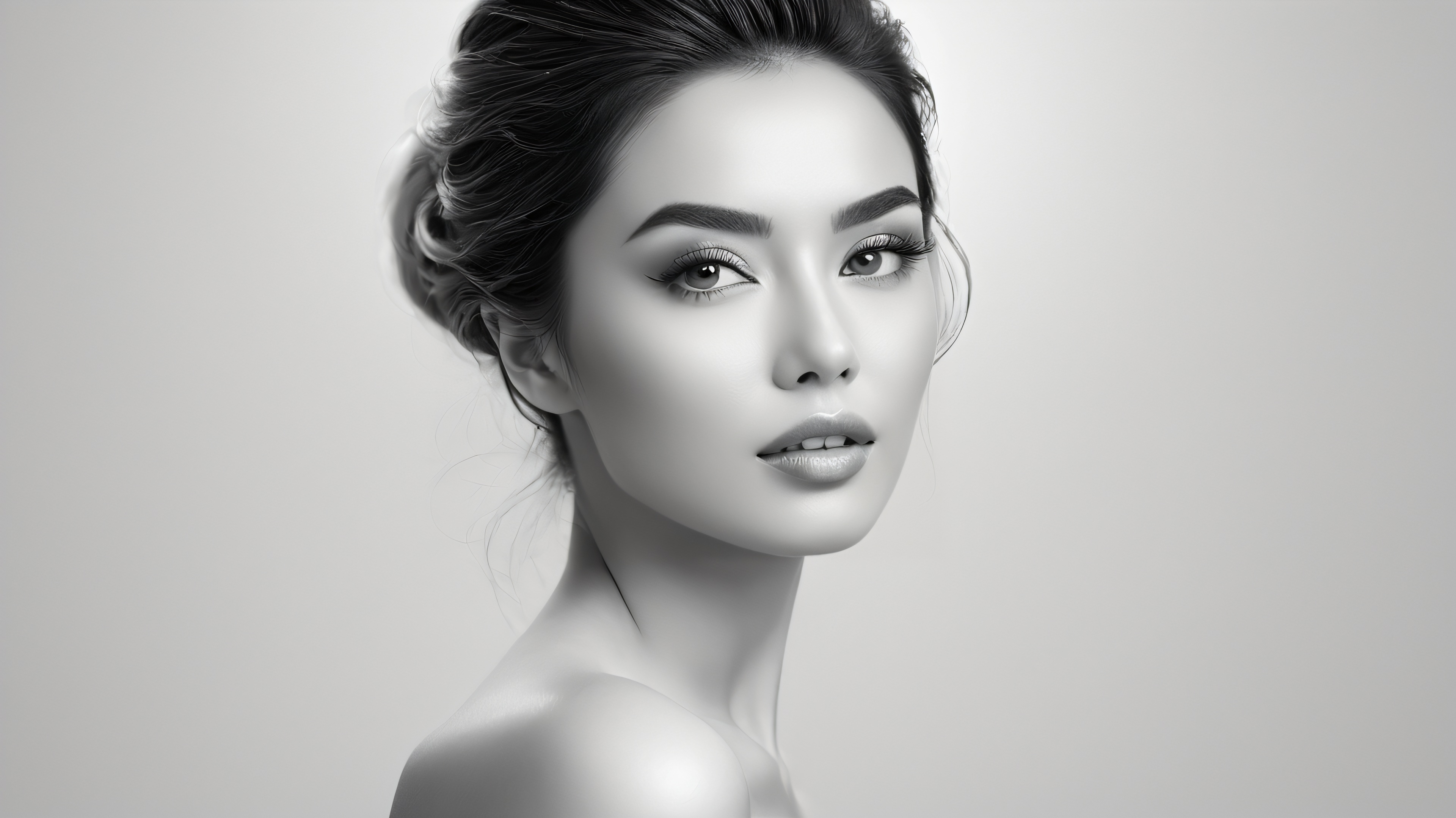 The image features a gentle, elegant woman surrounded by a subtle gradient of grayscale hues. The subtle play of light and shadow adds depth to her enigmatic expression, while the lack of color allows the viewer’s focus on the subject’s captivating facial structure. The overall atmosphere is tranquil, inviting contemplation and introspection.