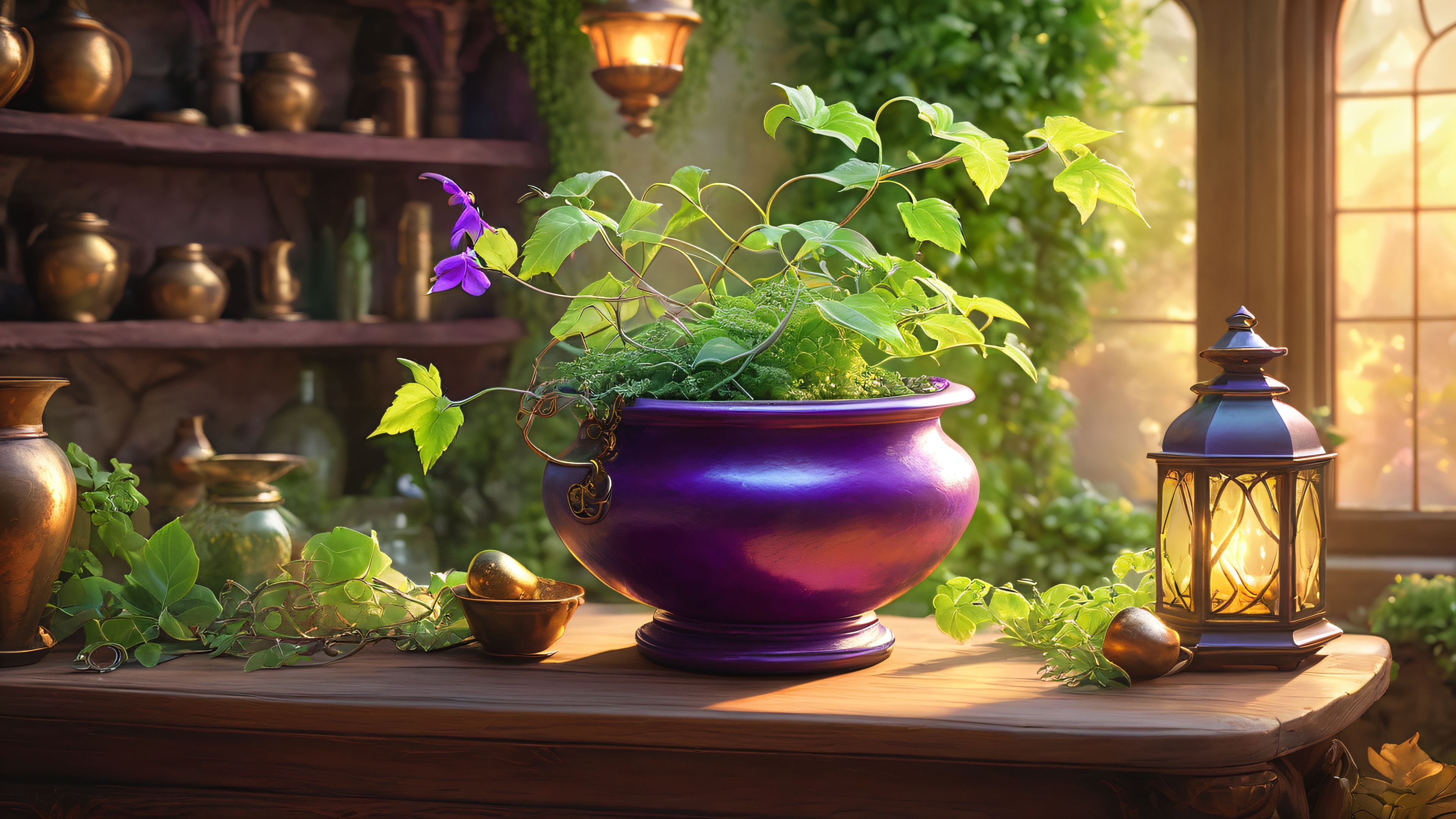Glowing purple cauldron surrounded by lush green vines and leaves, set in a dimly lit apothecary with wooden shelves and various artifacts. Suitable for desktop/pc use.