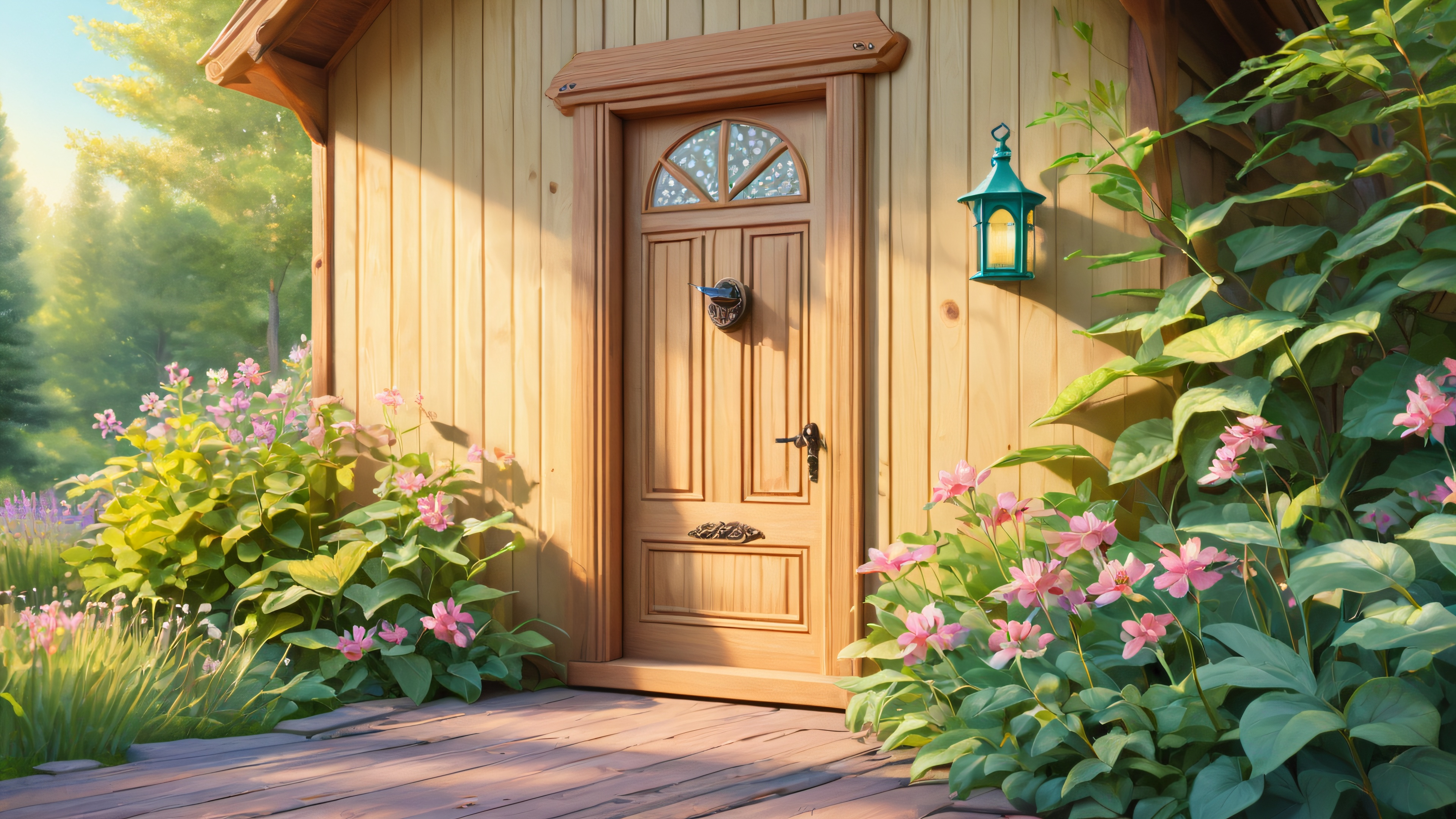 A warm afternoon sunlight bathes the whimsical scene of a charming wooden dog door amidst lush greenery and vibrant wildflowers. Intricate carvings of paw prints and leaves add a touch of playfulness to the rustic wooden door. Soft focus on the surrounding foliage creates depth, while textured brushstrokes and subtle layering enhance the watercolor-inspired illustration.