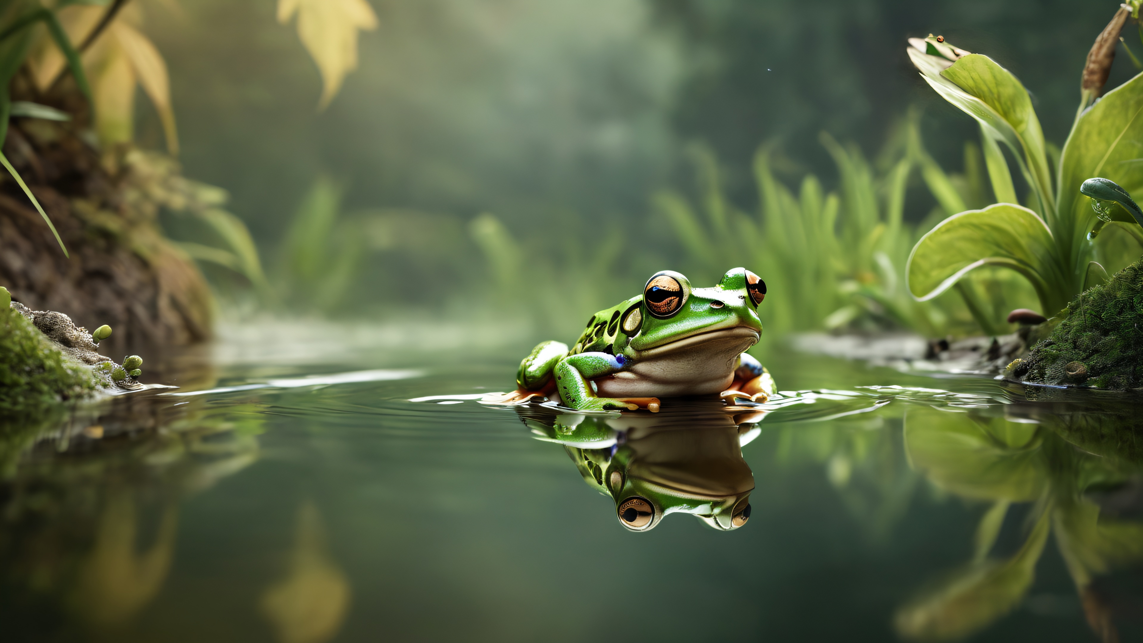 This breathtaking wallpaper features a stunningly realistic depiction of a frog perched on a weathered rock, surrounded by the tranquil beauty of a misty pond at dawn. The reflection of the lush greenery and towering trees in the calm water creates a sense of depth and serenity. The subtle play of light on the surrounding foliage adds warmth and texture to the scene, while the delicate ripples on the pond’s surface create a soothing visual rhythm.