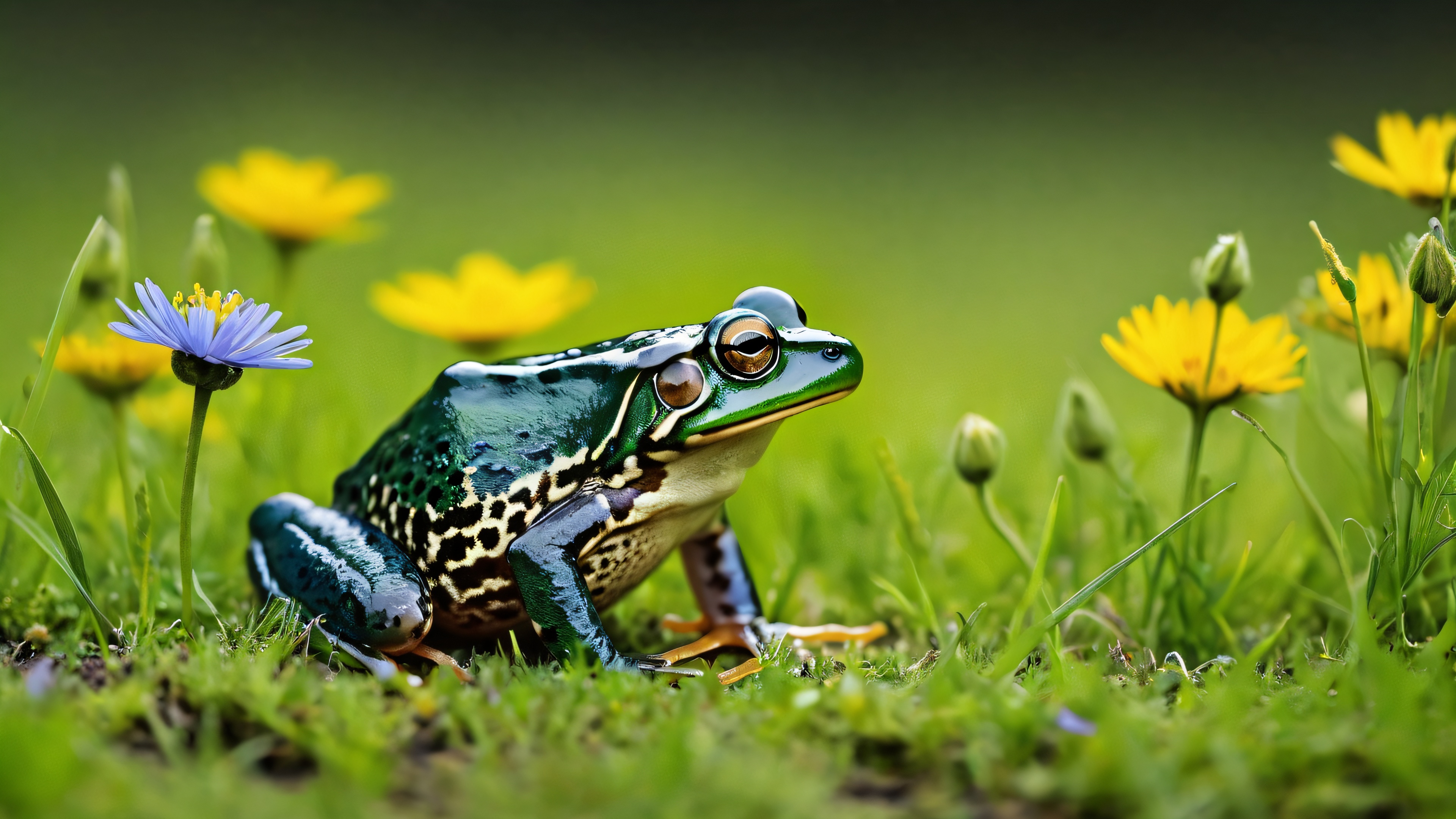 This stunning wallpaper features an award-winning digital art piece showcasing a beautifully illustrated frog perched amidst a lush meadow filled with delicate wildflowers and soft green grass. The striking contrast and deep blacks provide a sleek dark mode aesthetic, while the luminescent accents add a touch of elegance. The high-quality illustration is characterized by fine brush textures, delicate paper grain, and intricate micro-details.