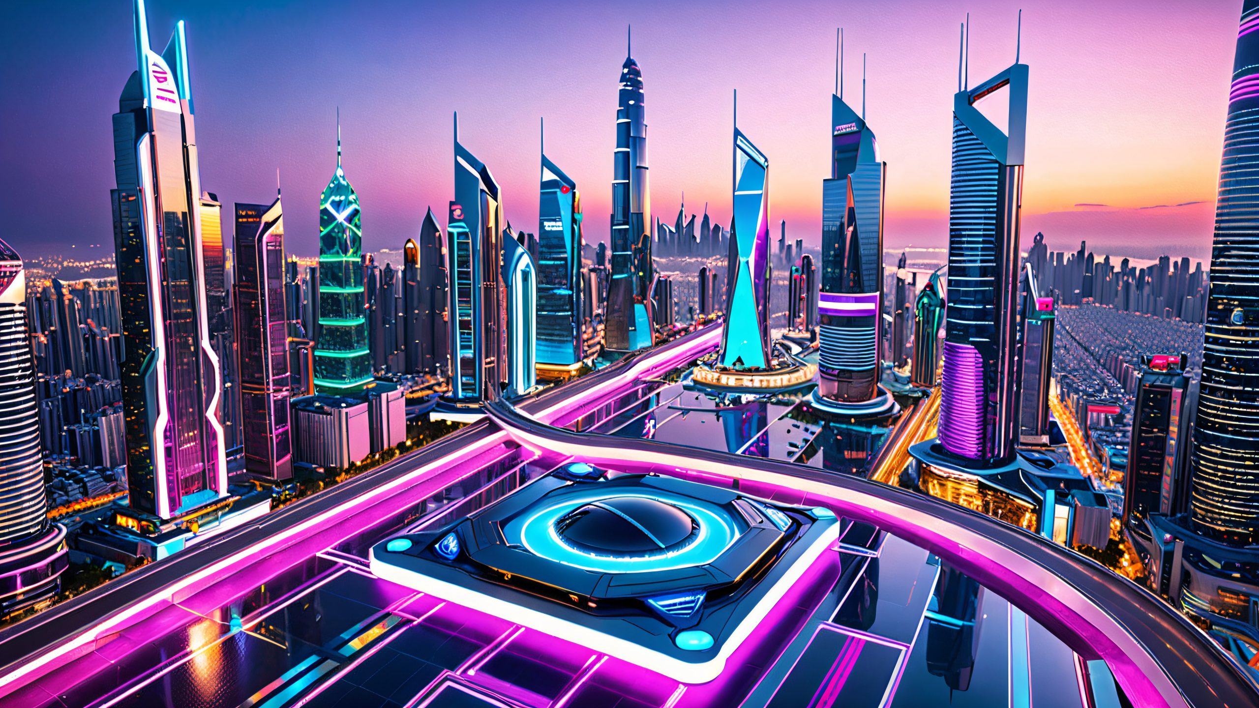 A futuristic cityscape with a hoverboard hovering above the central square, surrounded by towering skyscrapers and interconnected walkways.
