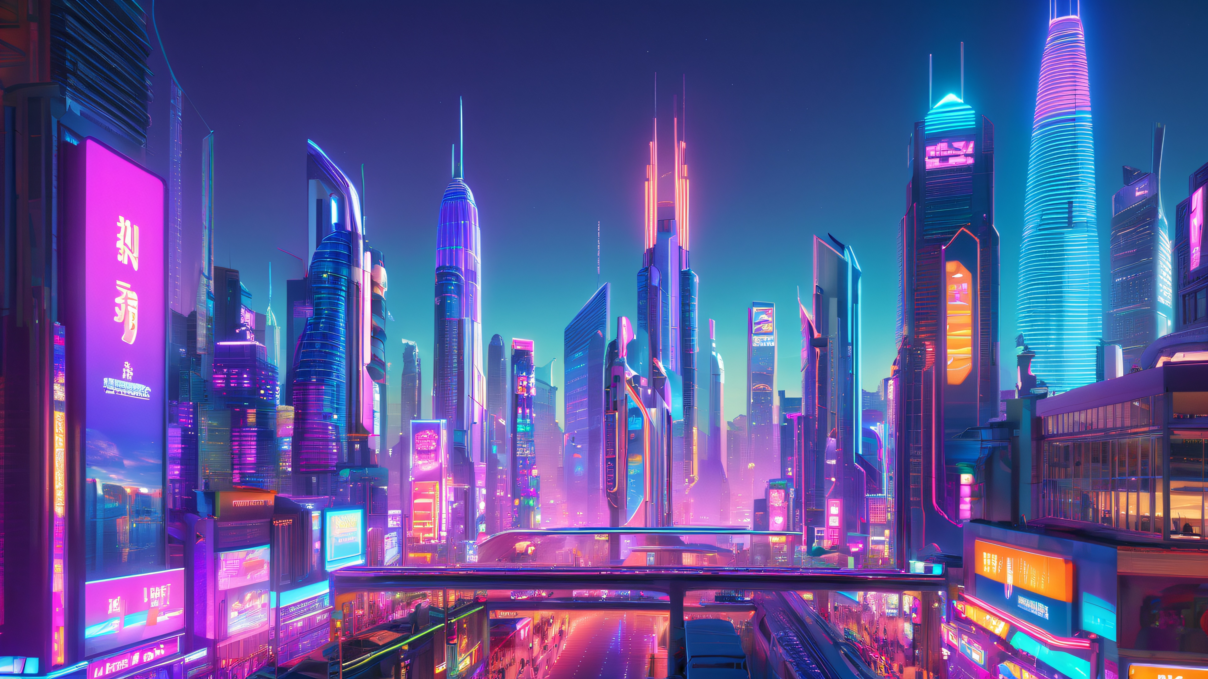 This breathtaking 4K desktop wallpaper features a hyper-realistic, 3D-rendered cityscape with sleek skyscrapers, neon-lit billboards, and a vibrant nightlife. The focus is on a lone figure standing on the rooftop of an iconic, angular building, looking out onto the city. The scene is illuminated by warm, pulsing neon lights with subtle highlights and shading, creating a sense of depth and dimensionality. The color palette features bright, electric blues and magentas, with accents of warm, golden lighting and subtle hints of green and purple, evoking a sense of energy and excitement.