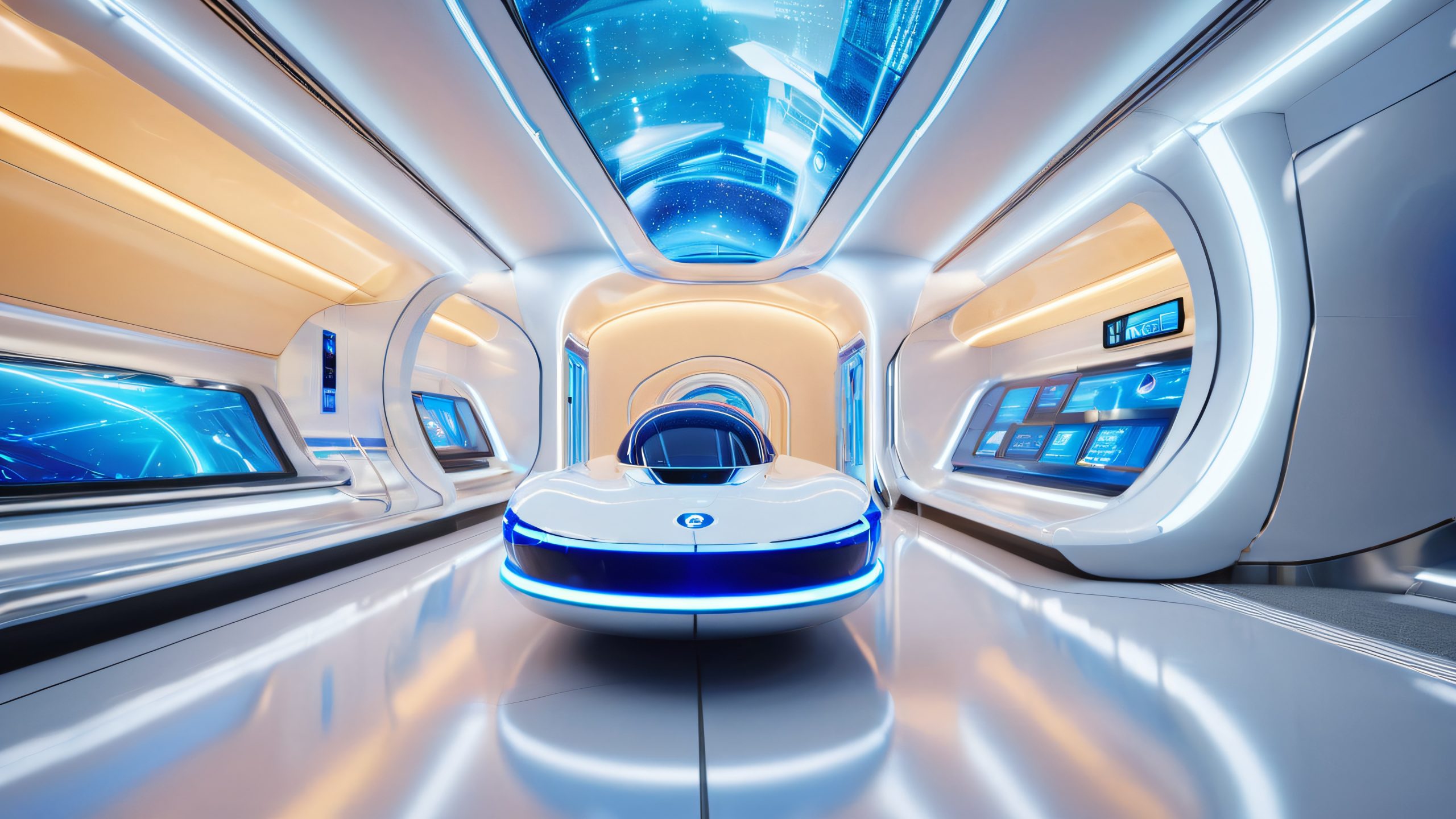A futuristic train station with metallic surfaces, glowing blue lines, and a pulsing LED light display.
