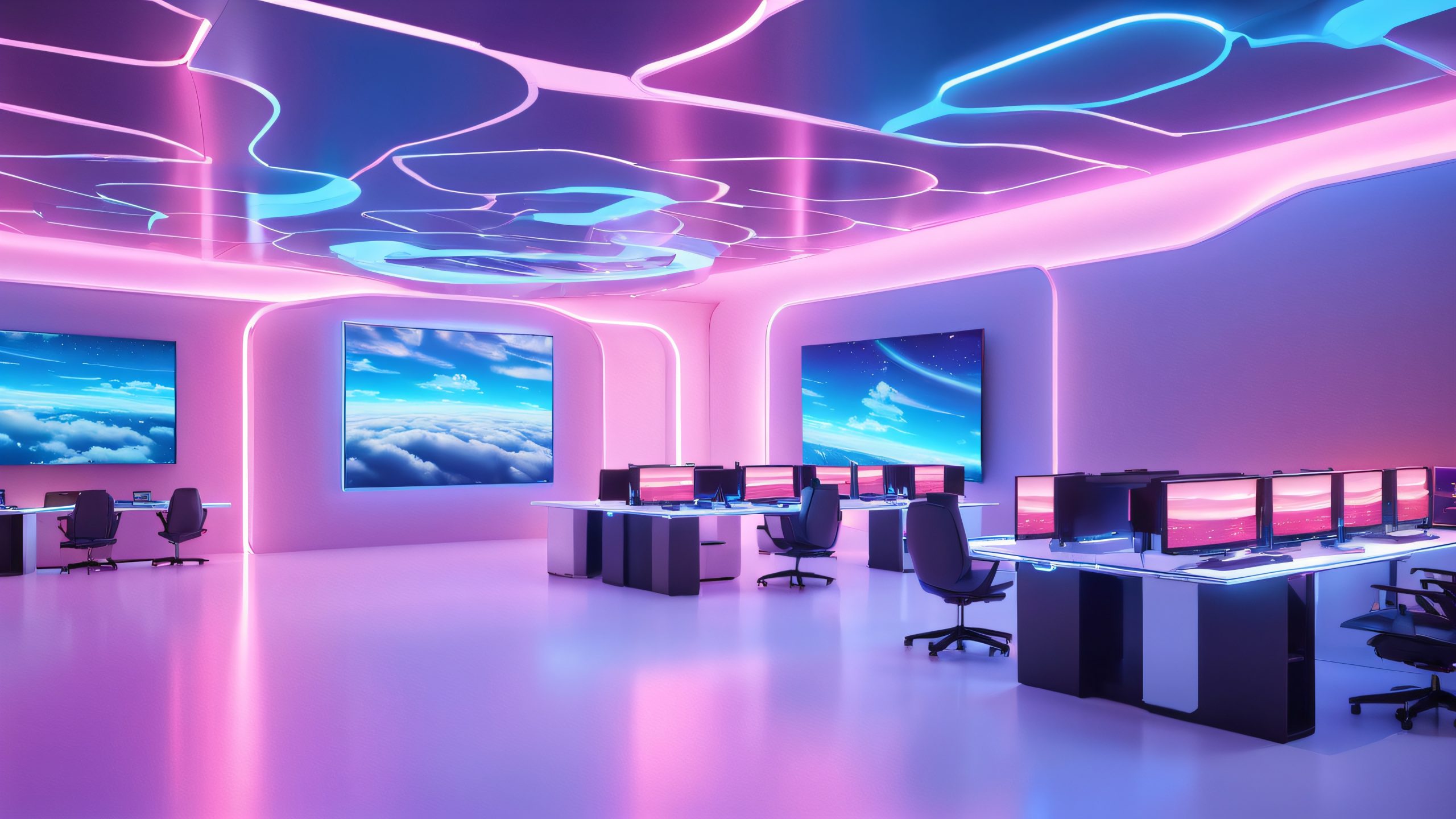 This breathtaking 4K wallpaper depicts a futuristic Discord server hub, where users’ avatars hover above rows of sleek, metallic desks. Swirling clouds of code and data streams blend seamlessly into the physical space, as if the digital realm is bleeding into the real world. Soft, cinematic lighting accentuates the neon hues and highlights the textures of the digital realm, with a palette of vibrant blues and purples punctuated by flashes of bright white, neon pink, and electric blue. A subtle gradient of deep indigo and dark grey adds depth and dimension to this highly detailed, masterfully rendered 3D scene.