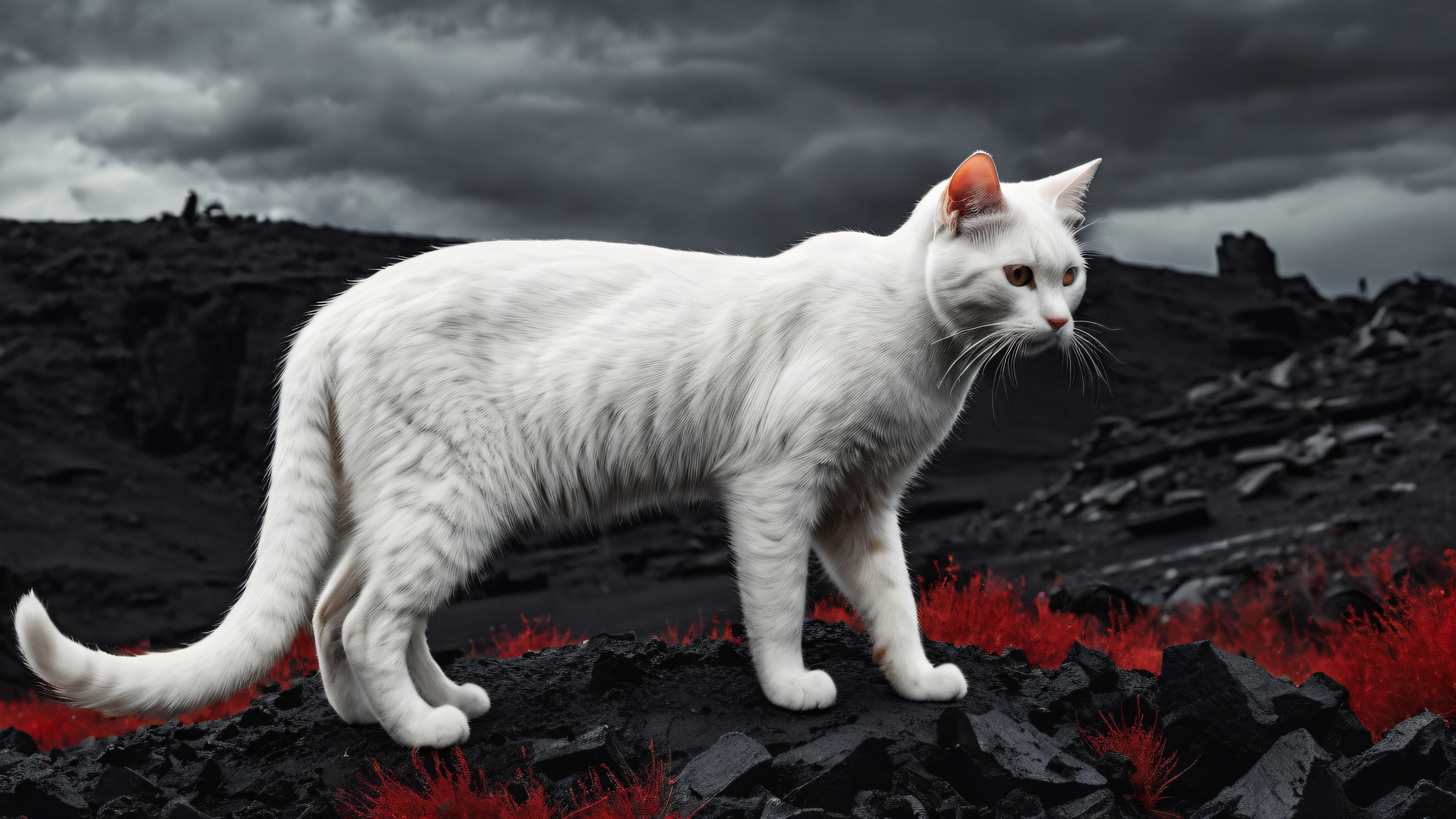 In this breathtaking digital artwork, a sleek and agile white cat stands victorious amidst the ruins of a once-thriving city. The image is set against a deep, pure void, showcasing a stunning contrast between the cat’s luminescent fur and the dark, gritty environment. The 16:9 aspect ratio allows for an unparalleled level of depth, as the cat’s sharp features are juxtaposed with the rugged textures of the wasteland.