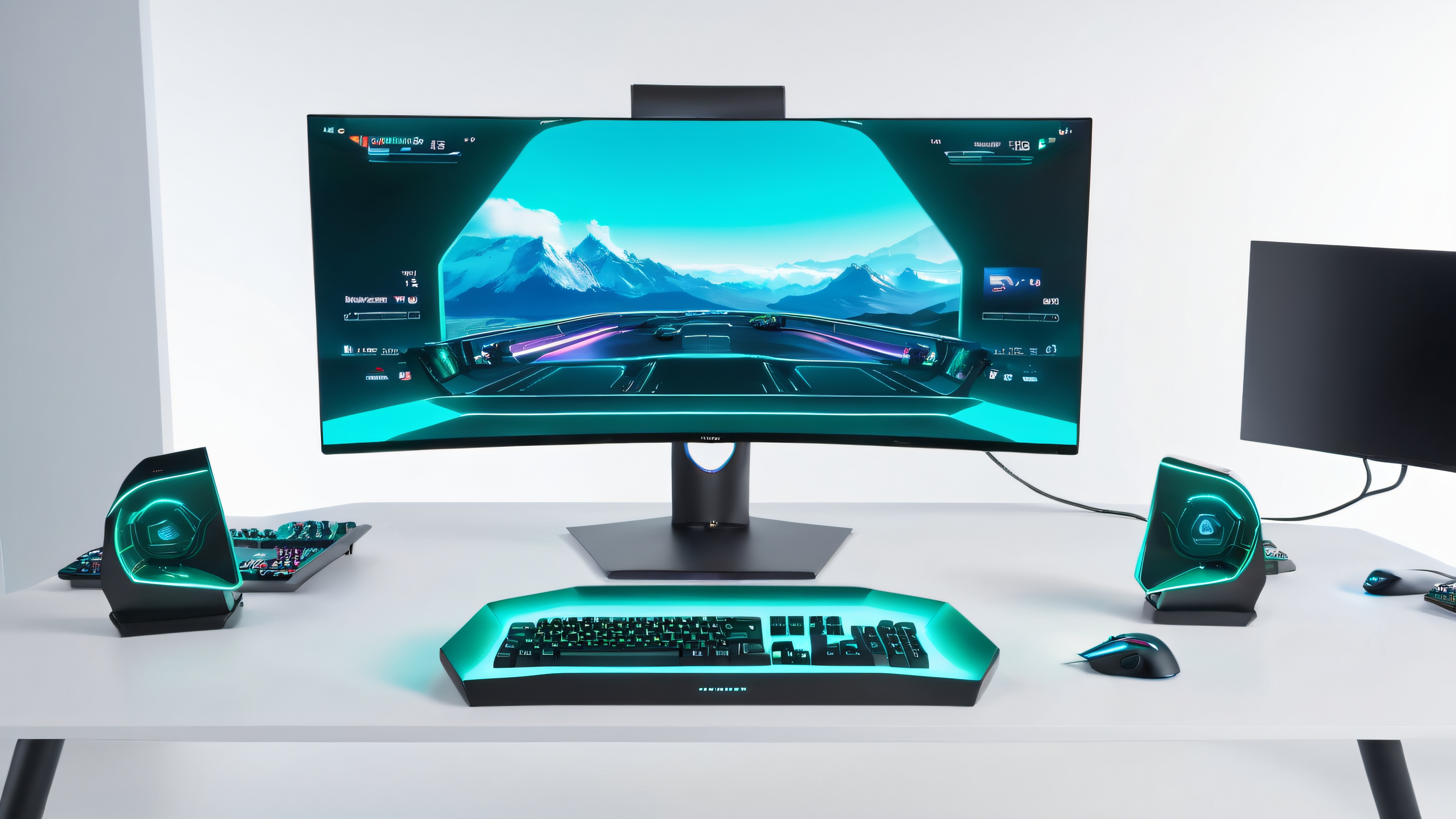 This stunning 4K wallpaper features a futuristic gaming cockpit with three curved monitors displaying vibrant 1440p and 4K desktop landscapes. The sleek, high-tech design is highlighted by soft blue-green LED lighting, geometric sculptures, and neon accents. The overall atmosphere is warm, inviting, and energizing, with a palette of deep blues, rich greens, and bright whites.