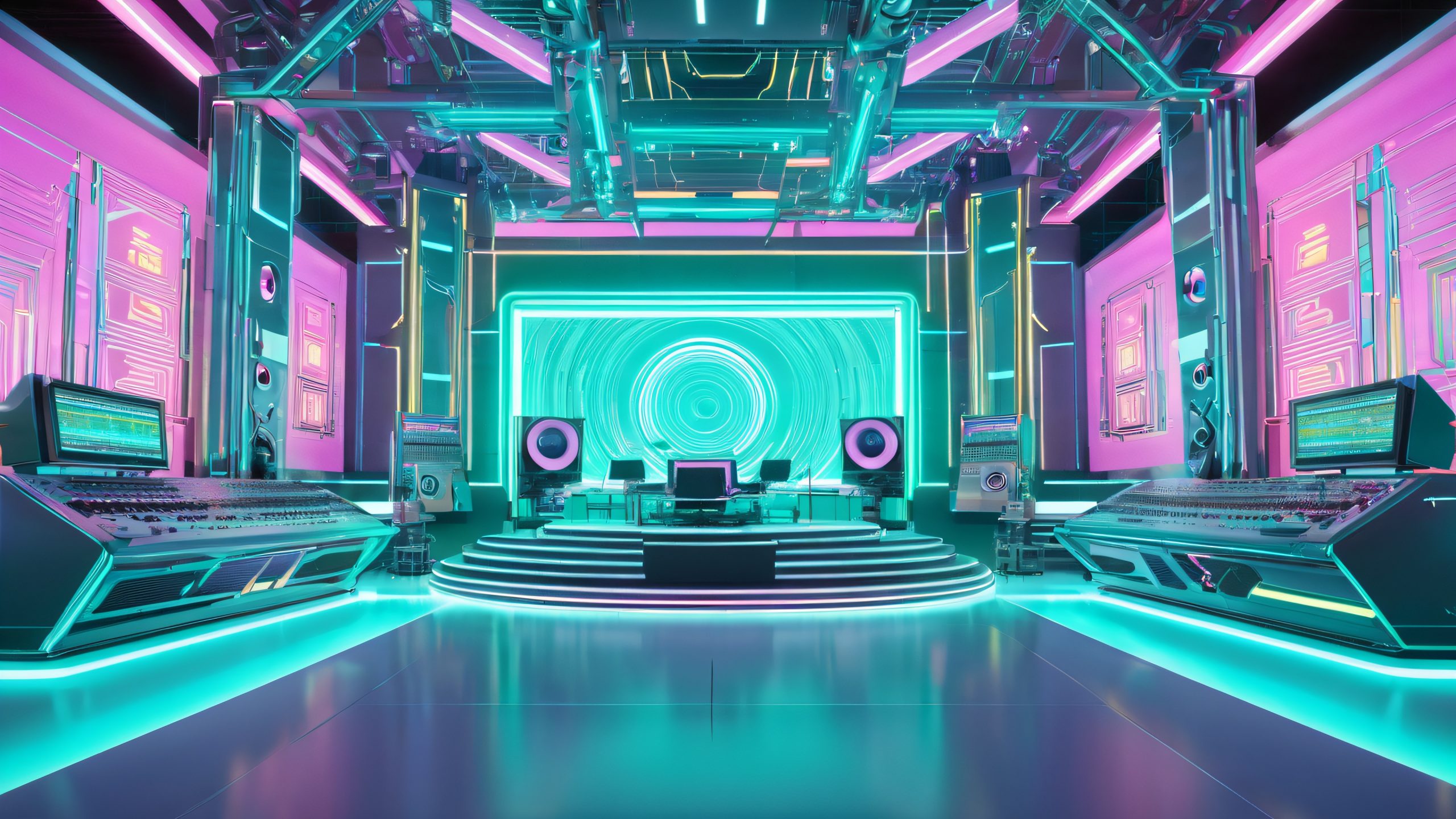 A futuristic recording studio with holographic projections and binary code, perfect for desktop wallpapers