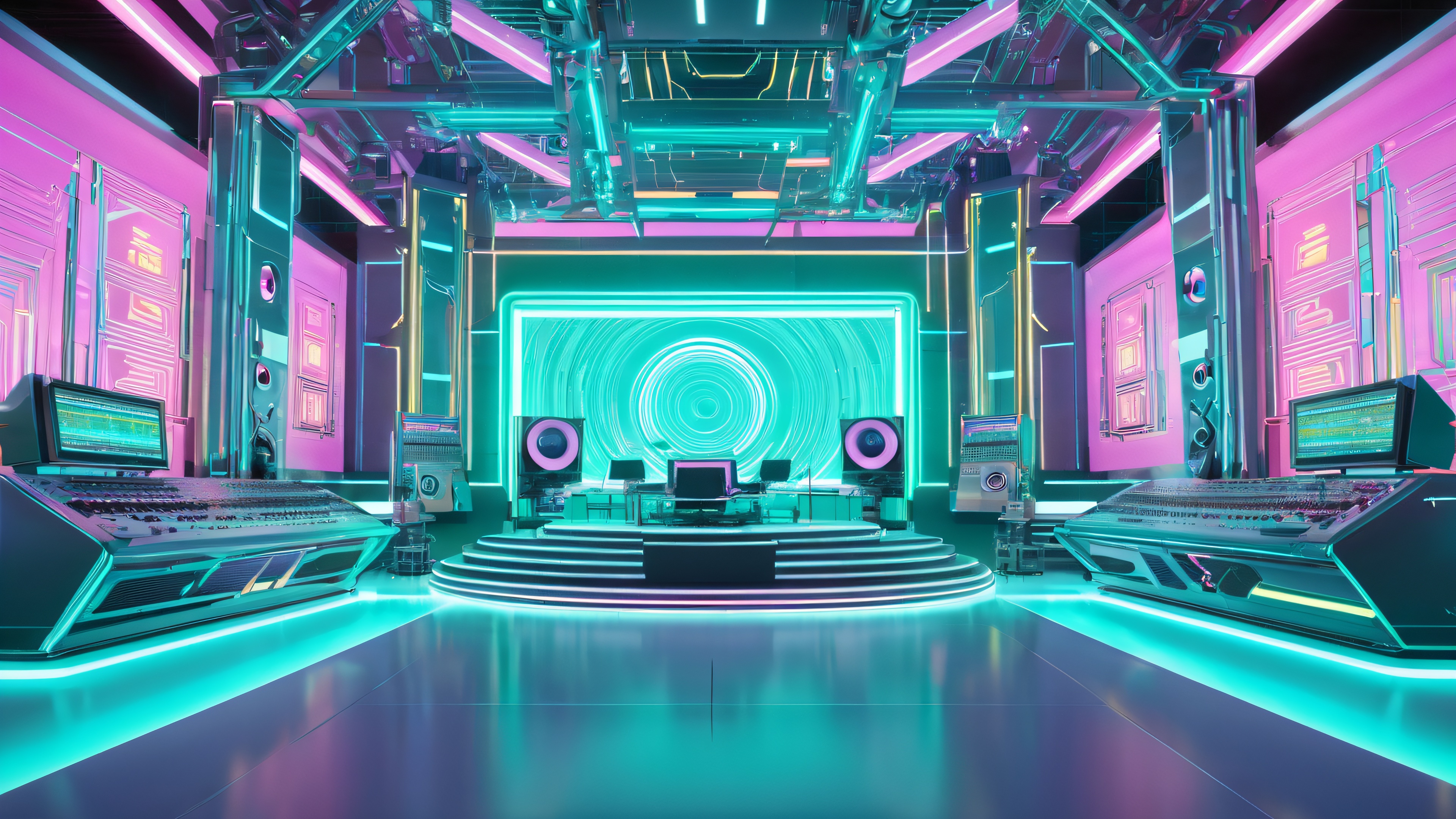 This stunning 4K wallpaper features a futuristic recording studio with holographic projections of Vocaloid characters amidst a labyrinth of neon-lit control panels and retro-futuristic machinery. The scene is bathed in a soft blue-green glow, with subtle hints of steam and fog adding depth and atmosphere. The wallpaper’s soft, diffused glow is punctuated by subtle highlights and shadows, evoking a sense of intimacy and focus on the music-making process.