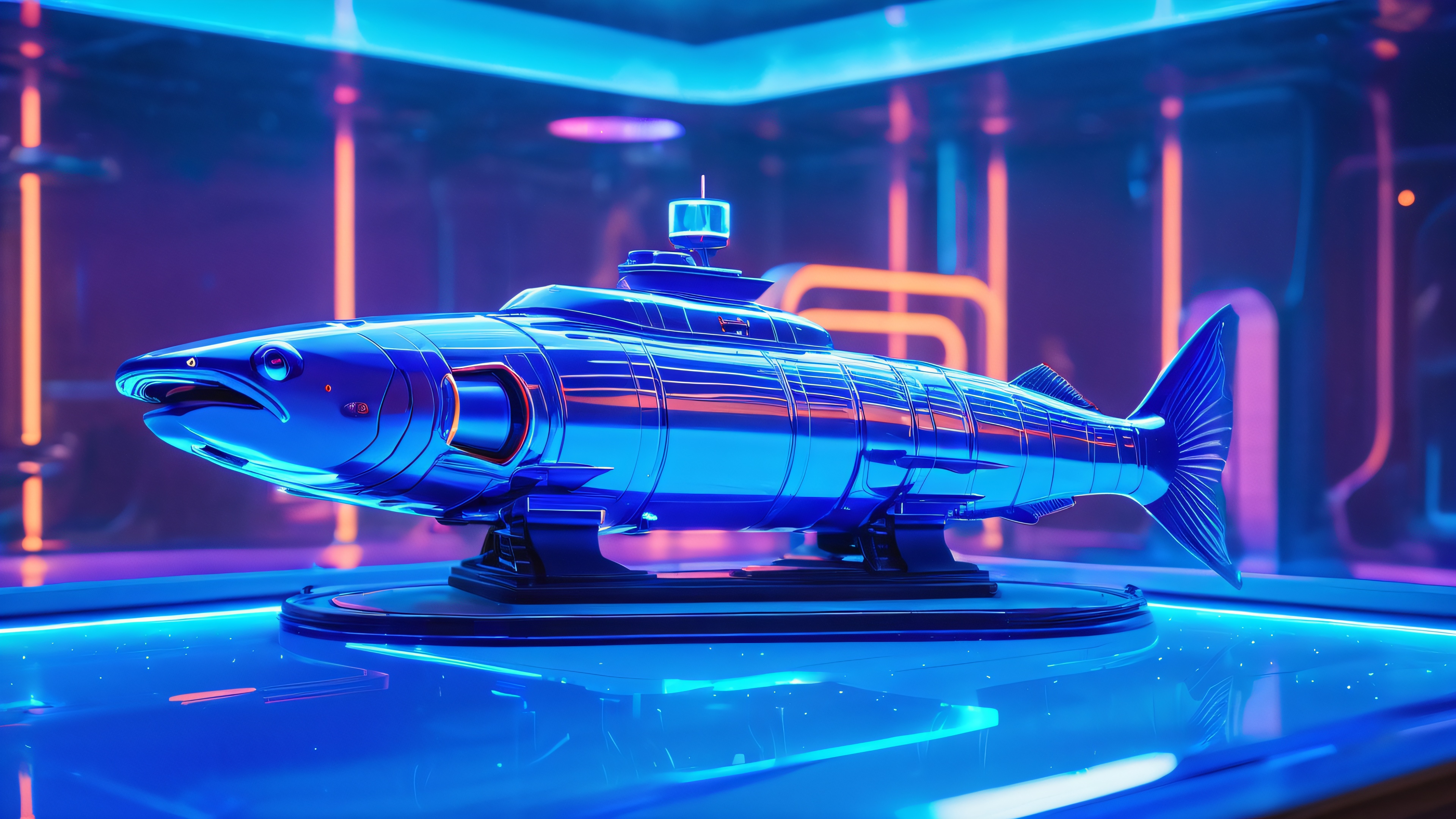 This stunning 4K wallpaper features a futuristic underwater tank with polished metal and glowing blue circuits, surrounded by a halo of soft blue light. Schools of bioluminescent fish swim in tandem around the tank’s metallic limbs, as if celebrating its advanced technology. The dimly lit aquarium has a sense of depth and perspective, reminiscent of a Japanese-style koi pond at night. Subtle refractions on the glass walls and ripples on the surface add to the sense of realism.