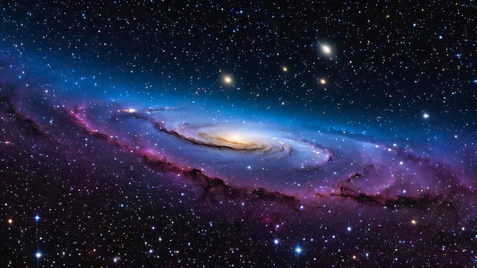 This breathtaking image showcases a majestic galaxy cluster, with hundreds of stars, gas, and dust suspended against a velvety black background. The scene is illuminated by the faint glow of distant galaxies, casting a subtle, ethereal light on the surrounding space. The stars and celestial bodies are rendered in incredible detail, with a palette of deep blues, purples, and blacks, punctuated by hints of golden yellow and crimson from the scattered stars.