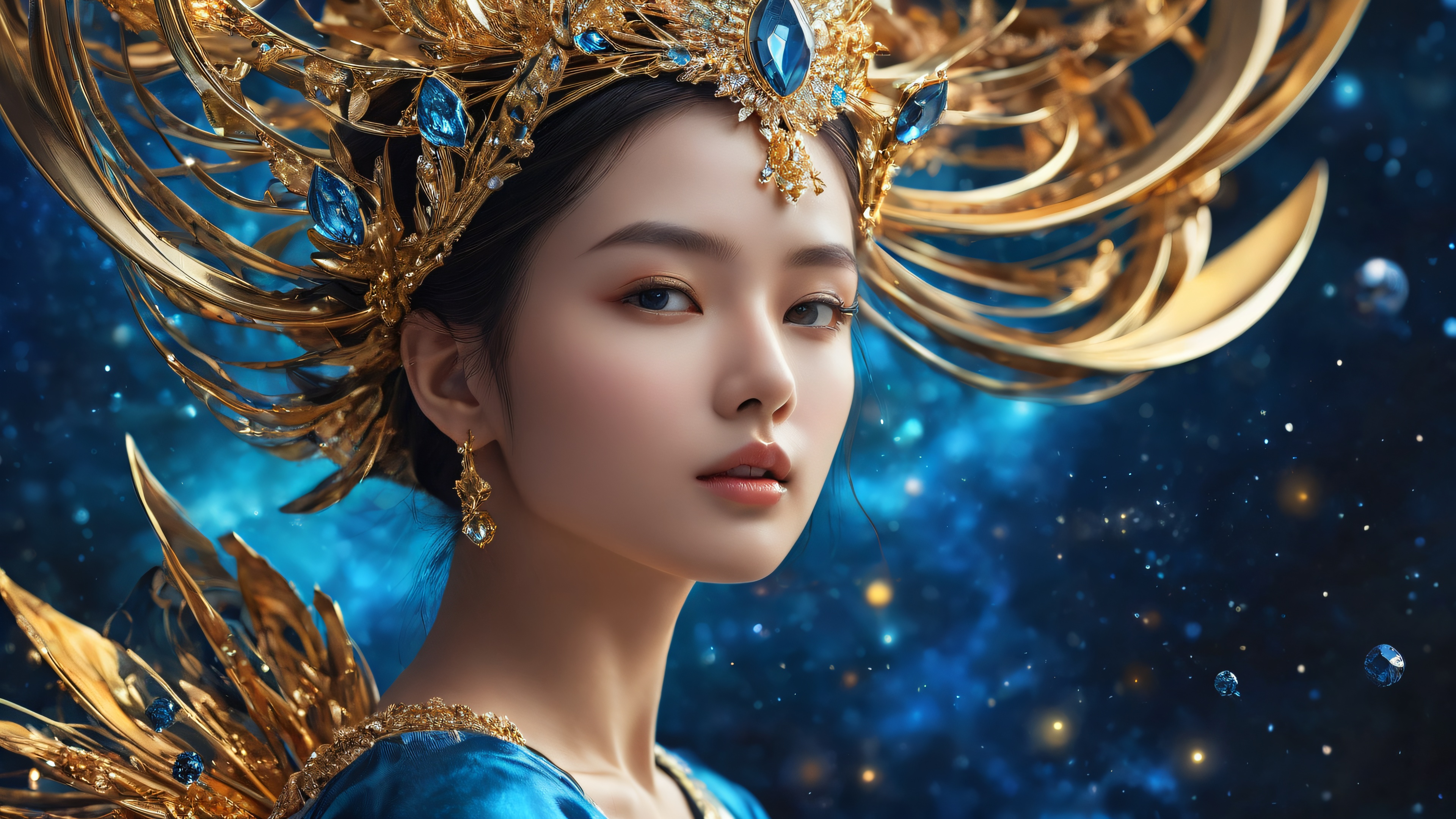 A breathtaking desktop wallpaper of Woman, Perfectly clean vast pure void, extreme depth of field, Award-winning digital art, pristine clarity, surreal elegance, cinematic framing, Ethereal lighting, Radiant, brilliant colors, ray traced reflections, pristine clarity, Bright and airy, [‘Obsidian’, ‘Gold’, ‘Galaxy blue’], 16:9 aspect ratio, ethereal lighting, radiant, brilliant colors, ray traced reflections, pristine clarity, award-winning digital art, epic breathtaking scale, stunning visual impact, perfect composition, highly textured surfaces, intricate micro-details, physically based rendering, macOS wallpaper aesthetic, masterpiece, highest quality, highly detailed, 8k resolution.