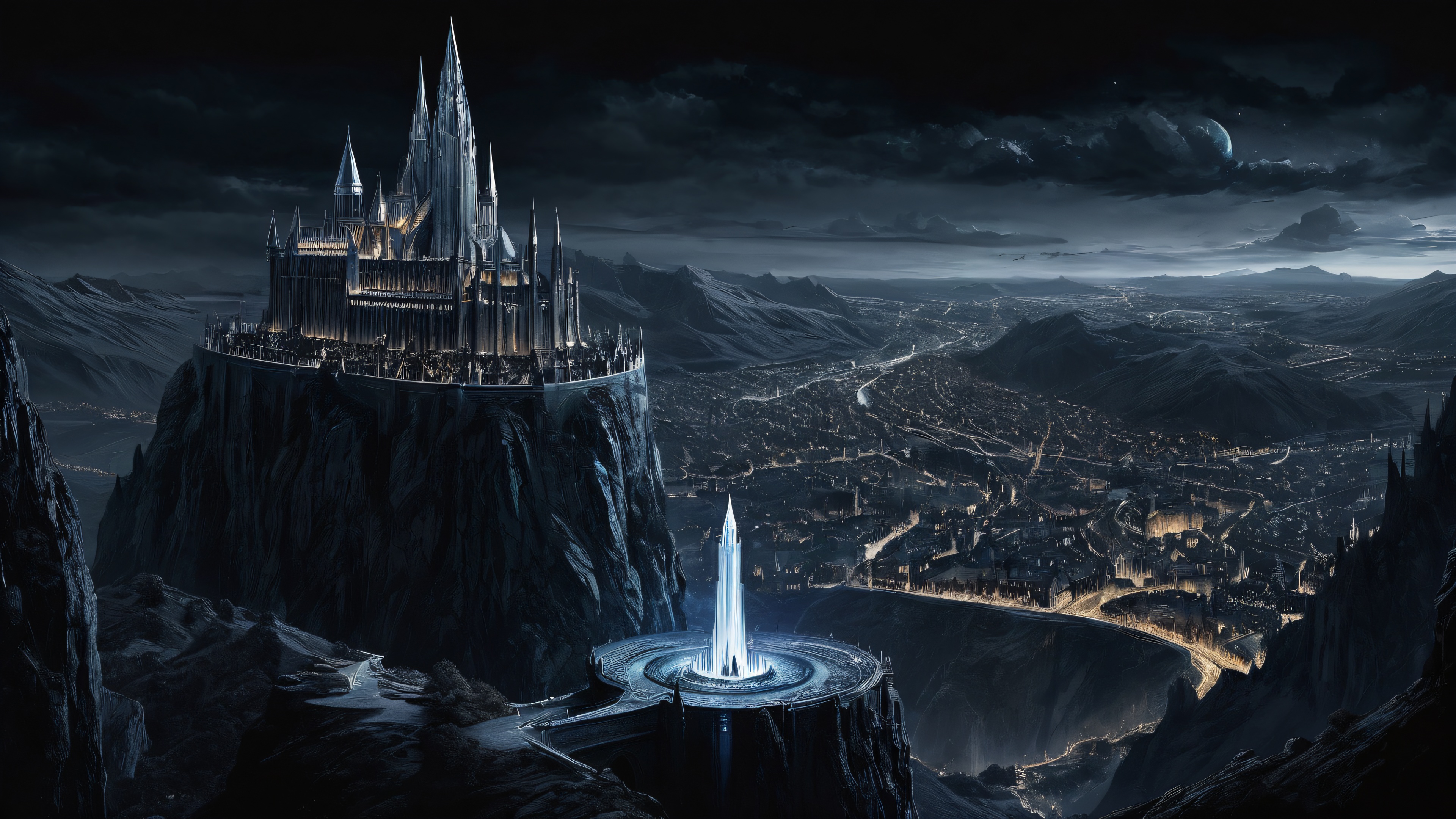 A breathtaking desktop wallpaper of Minas Tirith and Gandalf, Perfectly clean vast pure void, extreme depth of field with a focus on the cityscape, Award-winning digital art, pristine clarity, signature illustration style, Sleek dark mode aesthetic with deep perfect blacks, striking crisp contrast, and elegant luminescent accents, Dominant blues and whites to match the epic fantasy mood, 16:9 aspect ratio, elegant low-key lighting, deep perfect blacks, striking contrast, sleek dark mode aesthetic, luminescent accents, deep rich colors, award-winning digital art, epic breathtaking scale, stunning visual impact, perfect composition, highly textured surfaces, intricate micro-details, physically based rendering, macOS wallpaper aesthetic, masterpiece, highest quality, highly detailed, 8k resolution.