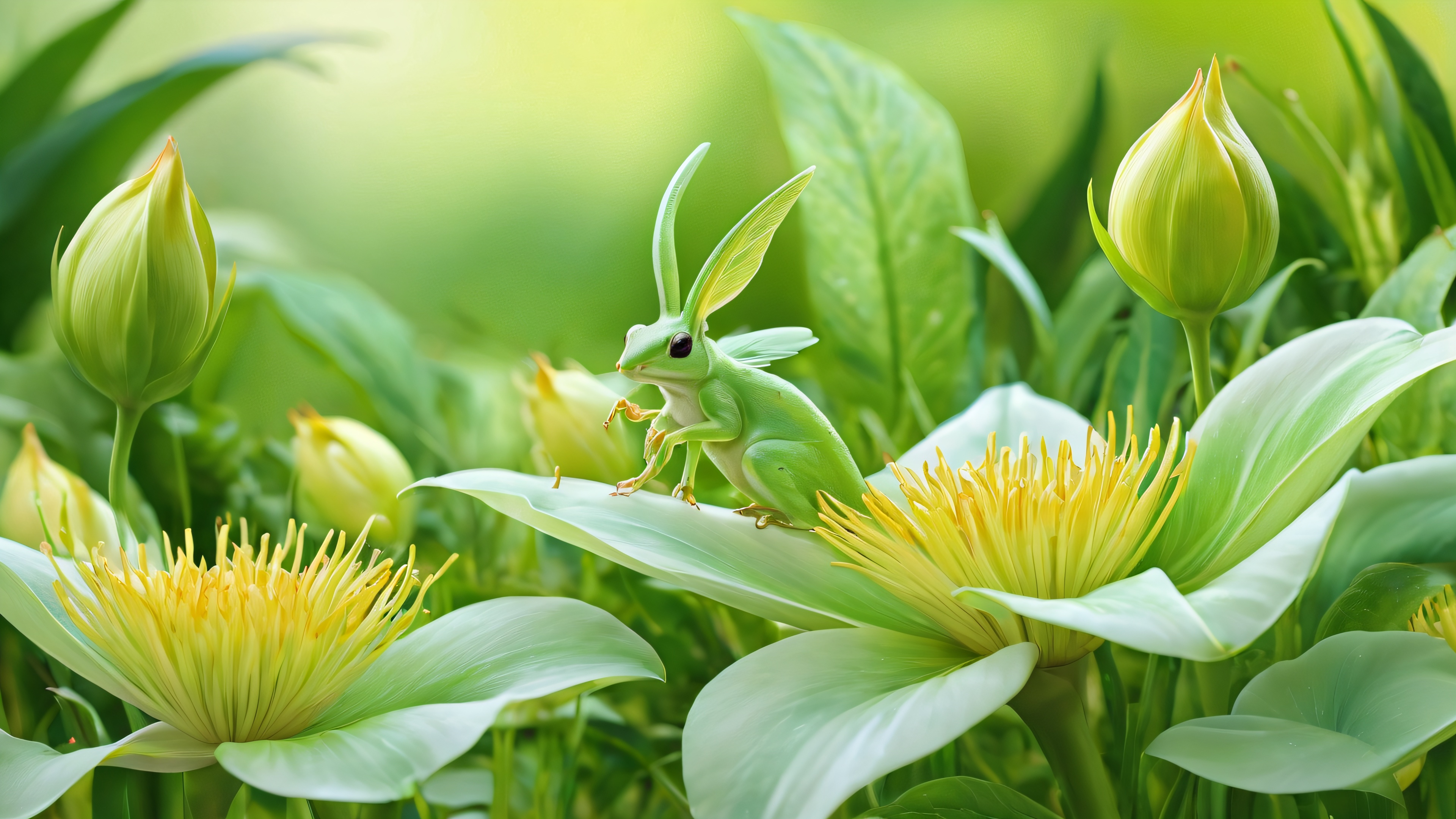 A breathtaking desktop wallpaper of Garden Creature, Perfectly clean vast pure void with extreme depth of field and lush foliage, Award-winning digital art, pristine clarity, Ethereal lighting with radiant colors, ray traced reflections, and pristine clarity. Bright and airy., [‘Pastel greens’, ‘Soft yellows’, ‘Creamy whites’], 16:9 aspect ratio, ethereal lighting, radiant, brilliant colors, ray traced reflections, pristine clarity, award-winning digital art, epic breathtaking scale, stunning visual impact, perfect composition, highly textured surfaces, intricate micro-details, physically based rendering, macOS wallpaper aesthetic, masterpiece, highest quality, highly detailed, 8k resolution.