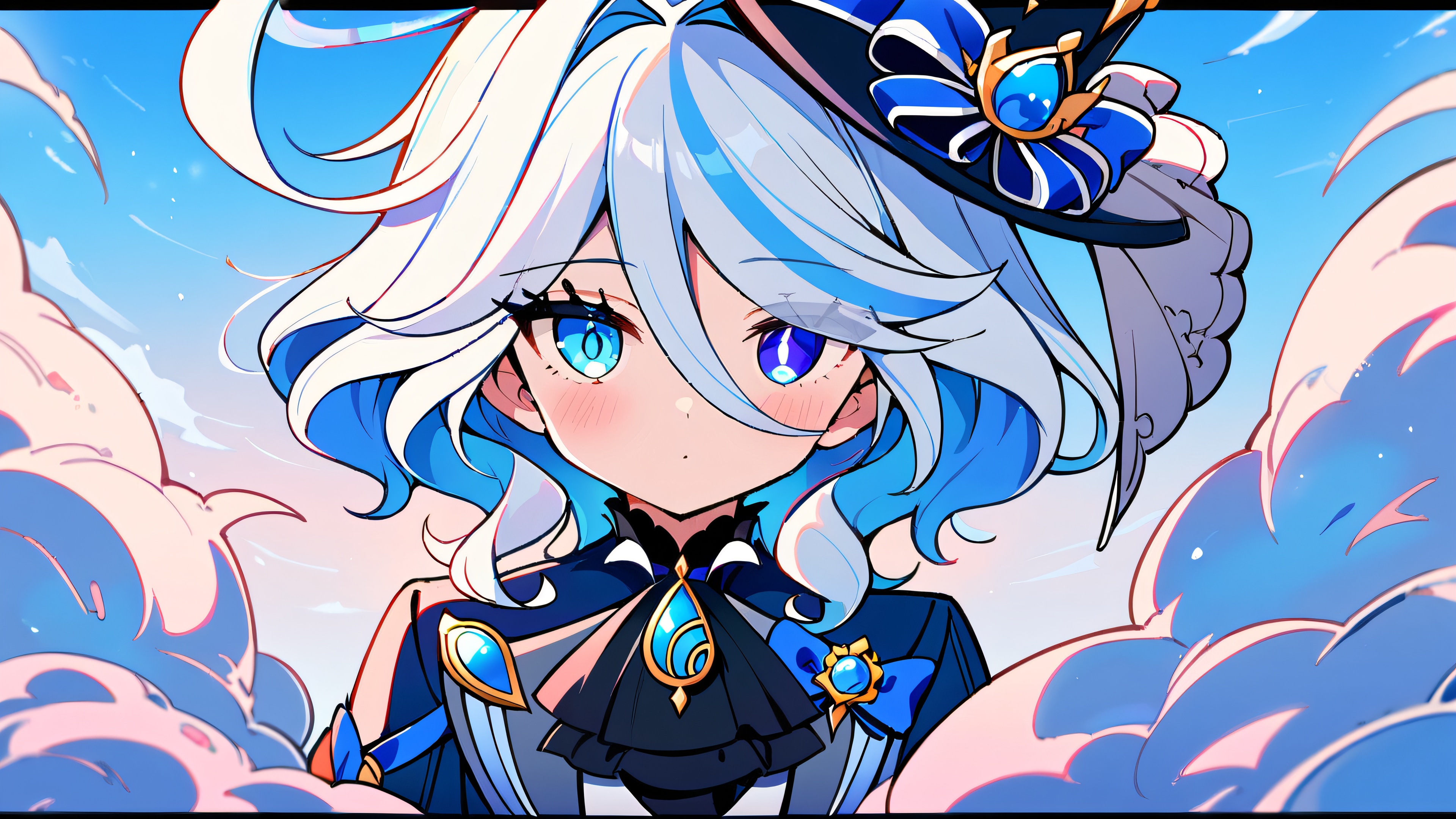 1girl, furina, genshin impact, solo, masterpiece, best quality, very aesthetic, absurdres, highly detailed, looking at viewer, perfectly clean vast pure void, extreme depth of field, [‘Pink’, ‘White’], 16:9 aspect ratio, bright and airy, ethereal lighting, beautiful sky, cinematic lighting, vivid colors